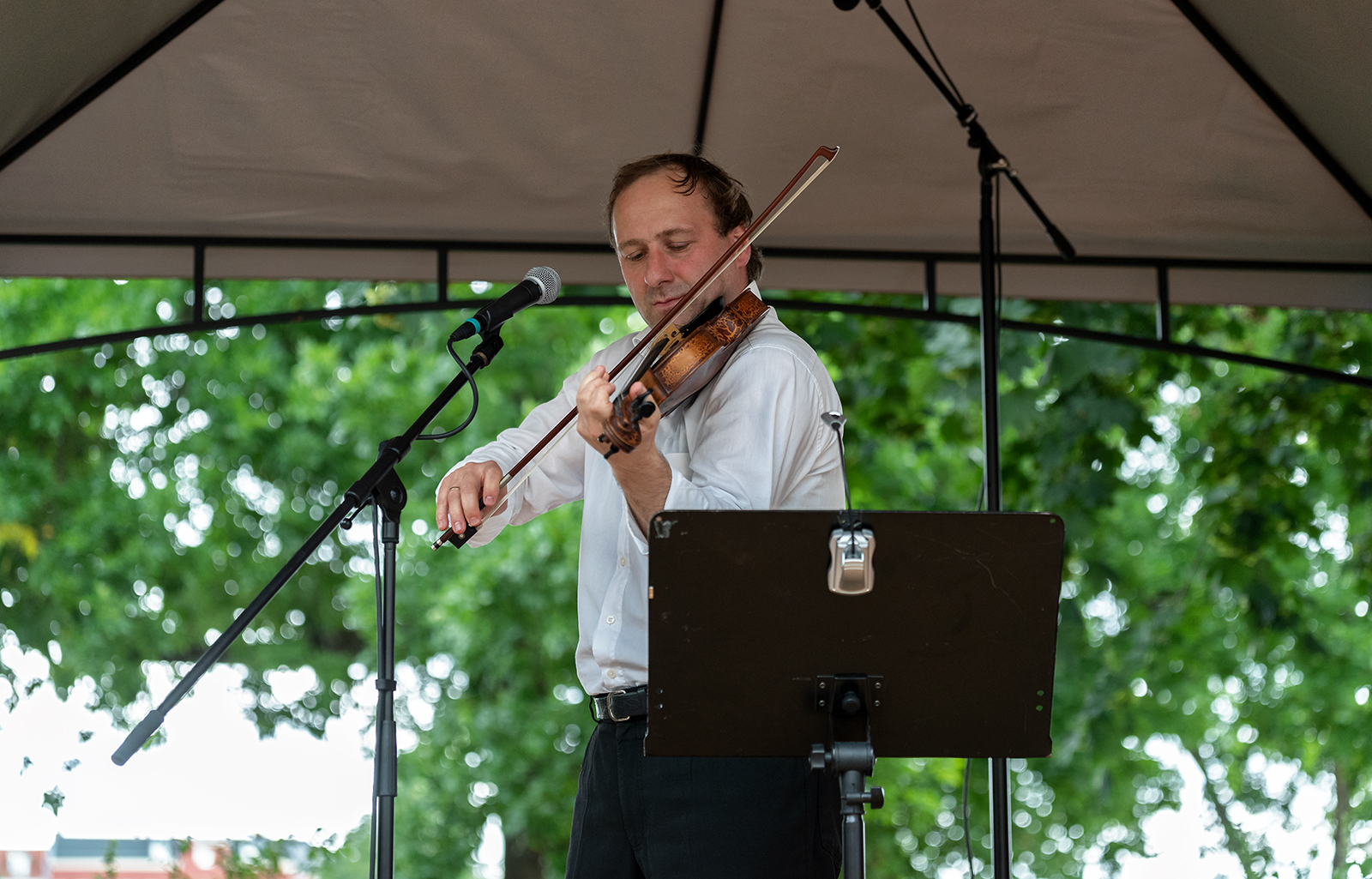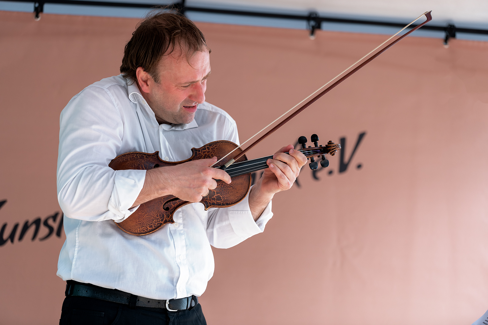 Statt Fußball-Hymnen gab es allerlei zu Abständen. Mit „Abstände in der Musik“ griff der Violinist musikalisch auf, was uns im Moment so umtreibt und verband dieses mit zahlreichen Anekdoten aus dem geschichtlichen Kontext und seinem eigenen Leben. Dabei hat es ihm besonders Paganini angetan, der Teufelsgeiger, auf dessen Spuren er sich bewegt und der selbst Erfahrungen mit Pandemien in Zeiten der Cholera gesammelt hat.