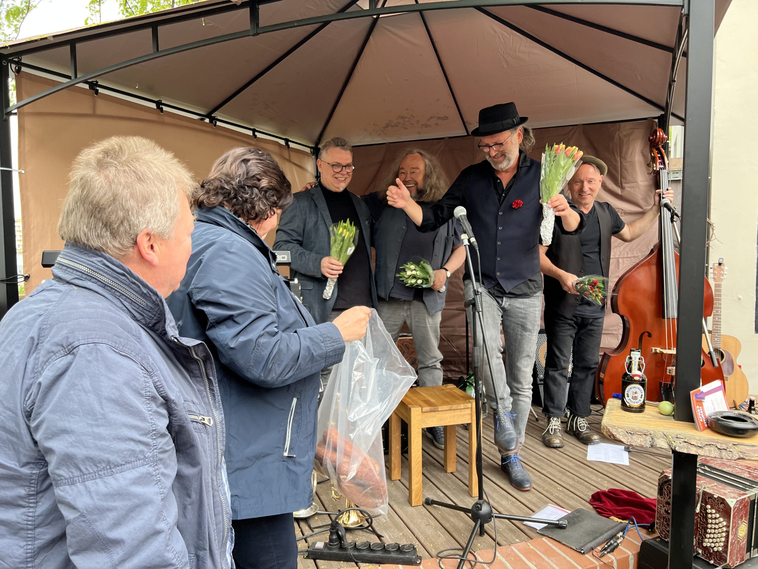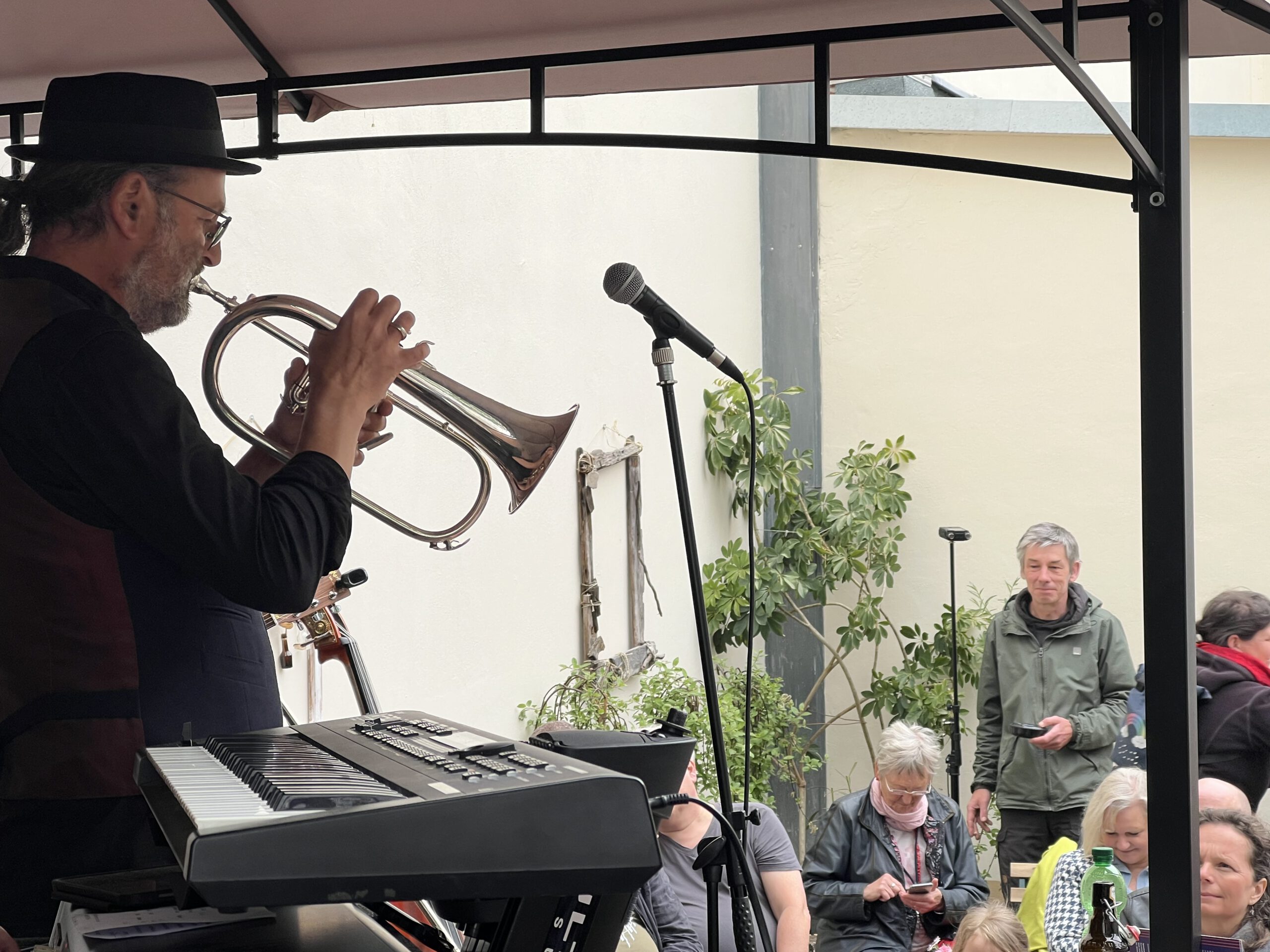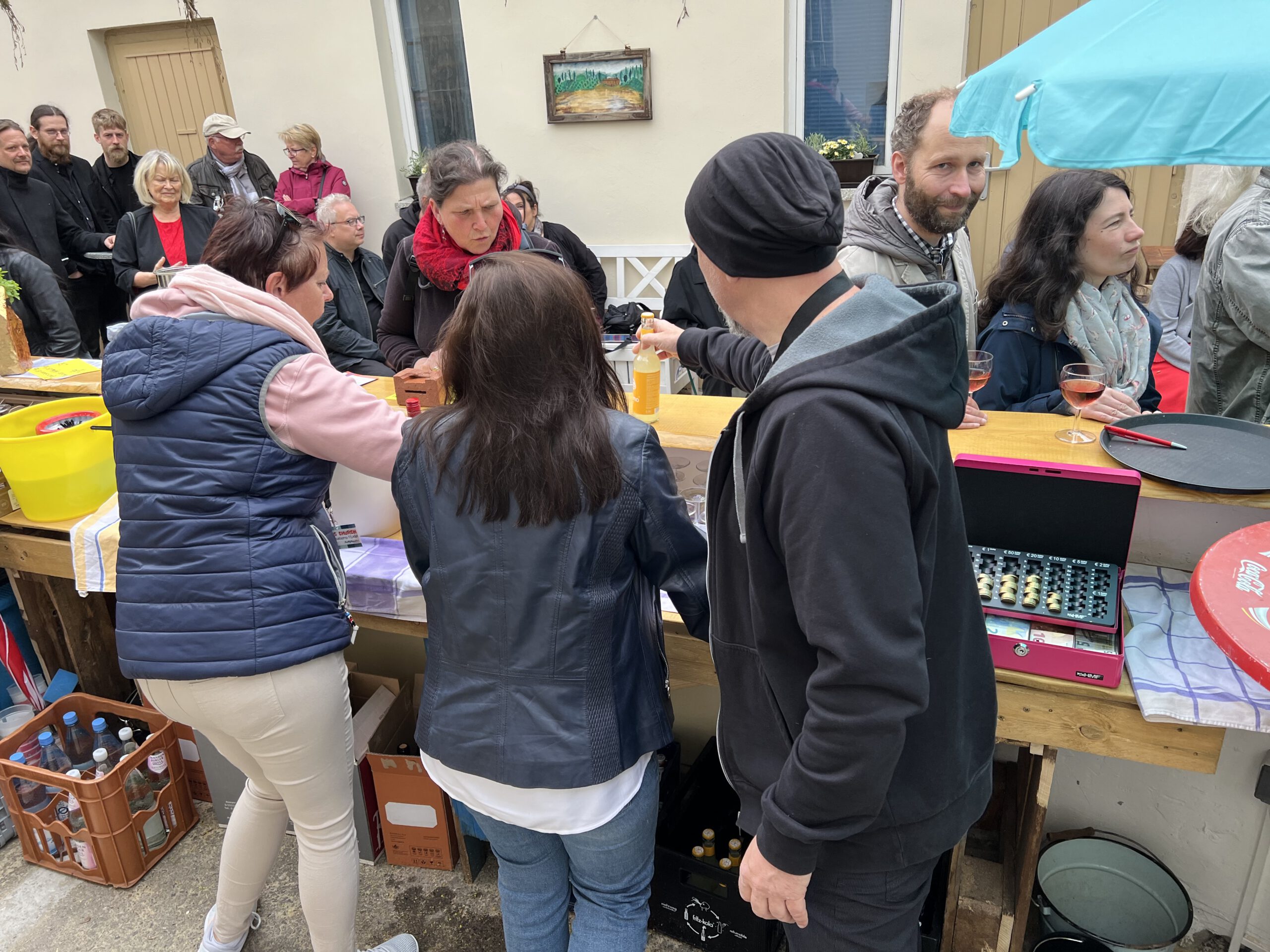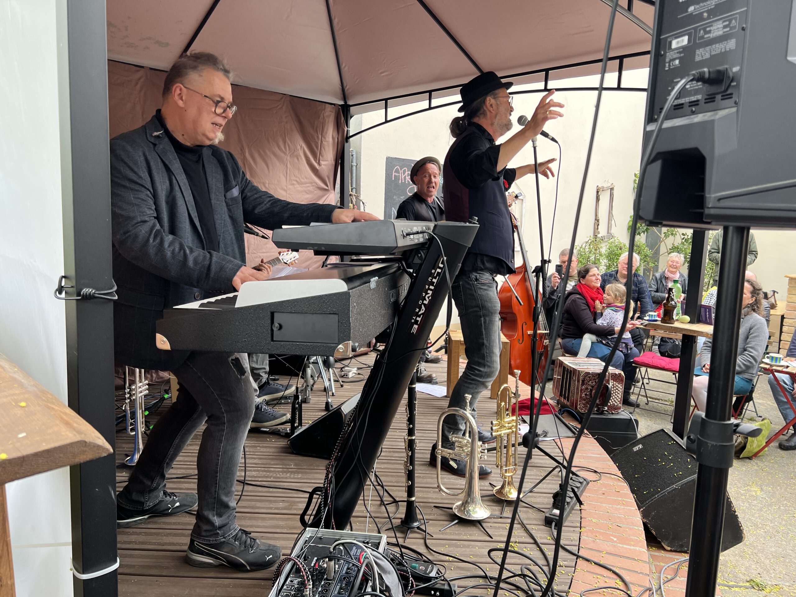 Und so dauerte es denn auch nicht lange, und unser wie üblich gut gefüllter Hof war am toben! Kurzweil, markant pointierter Humor und musikalisch-handwerkliche Perfektion waren das Geheimnis dieses durchweg gelungenen Sonntags. Auch Seidels vermeintliches Lampenfieber wurde, so es denn vorhanden war, professionell kaschiert, und das gar im Angesicht der eigens zum Event delegierten Dorfabordnung (welche die Kapelle zum Ende gar mit einem reichhaltigen Sortiment nahrhafter Wurstprodukte beschenken sollte).