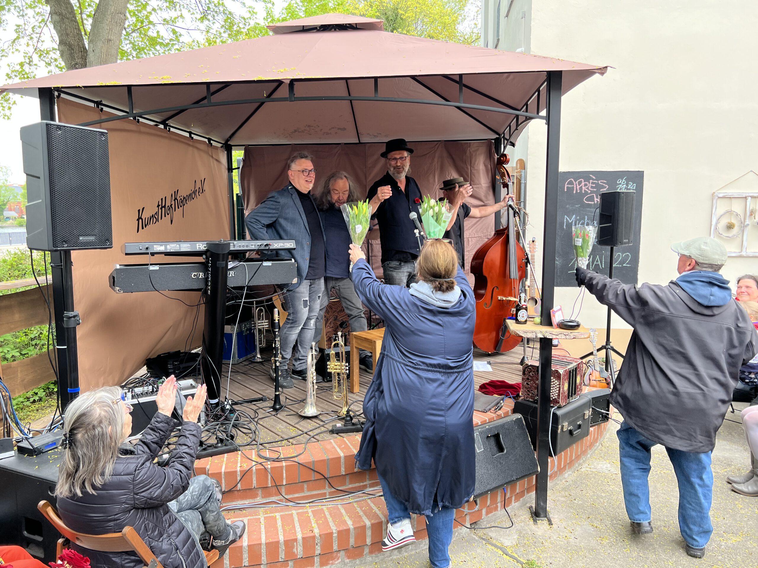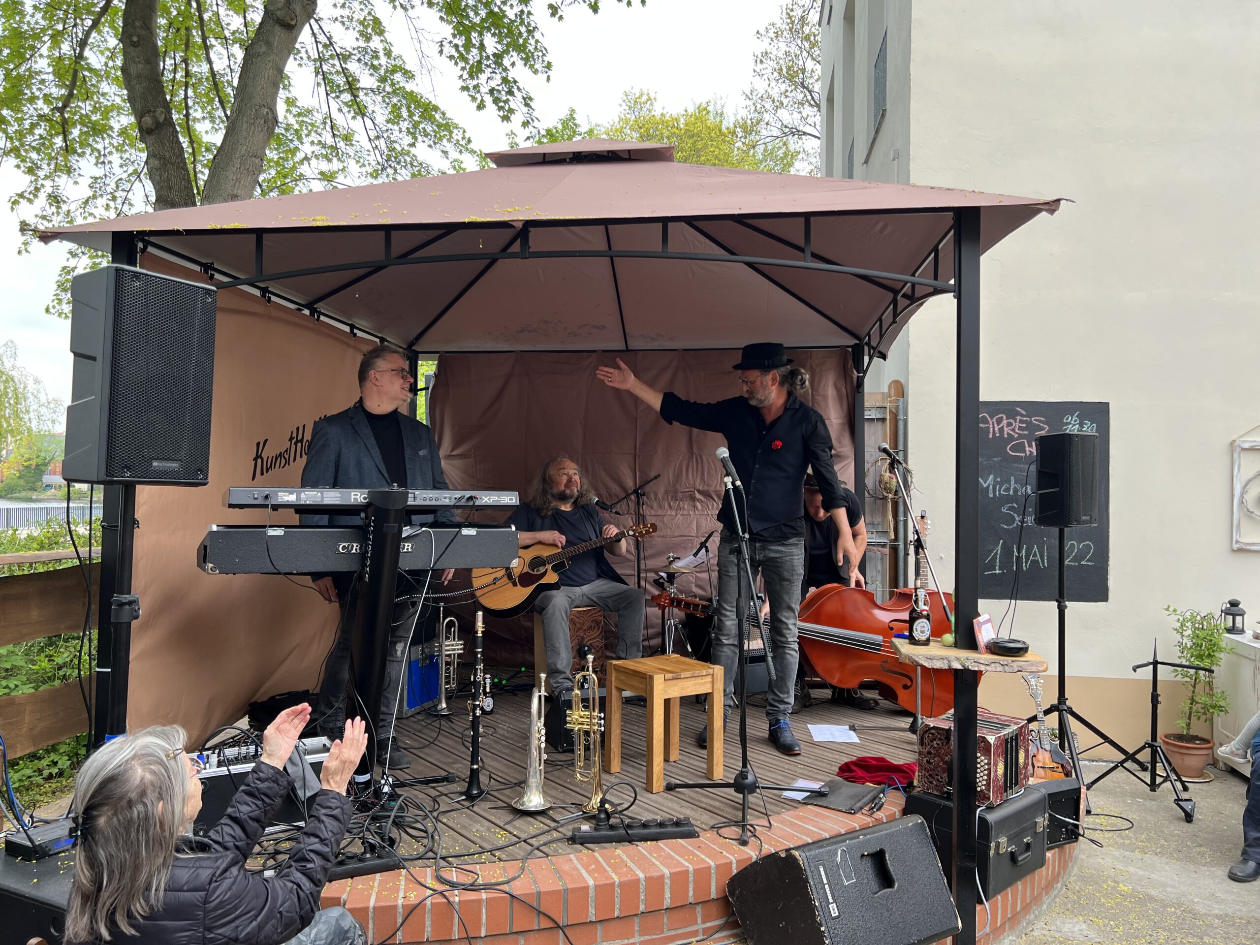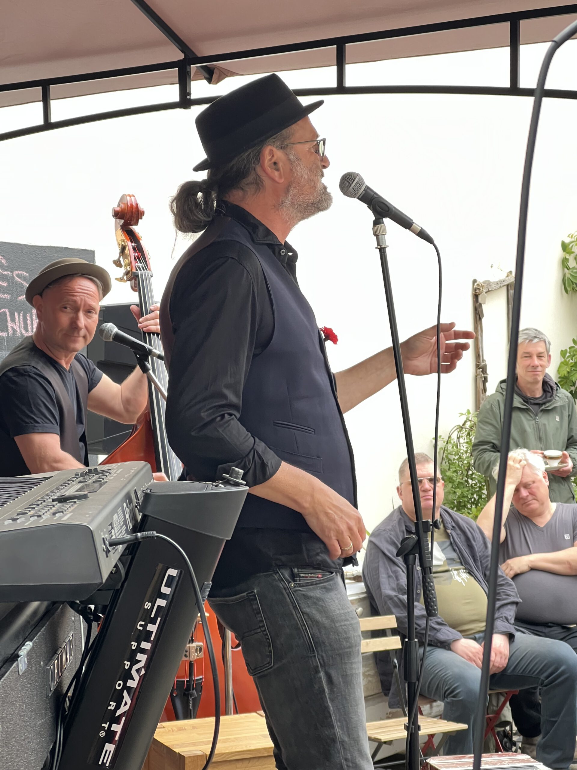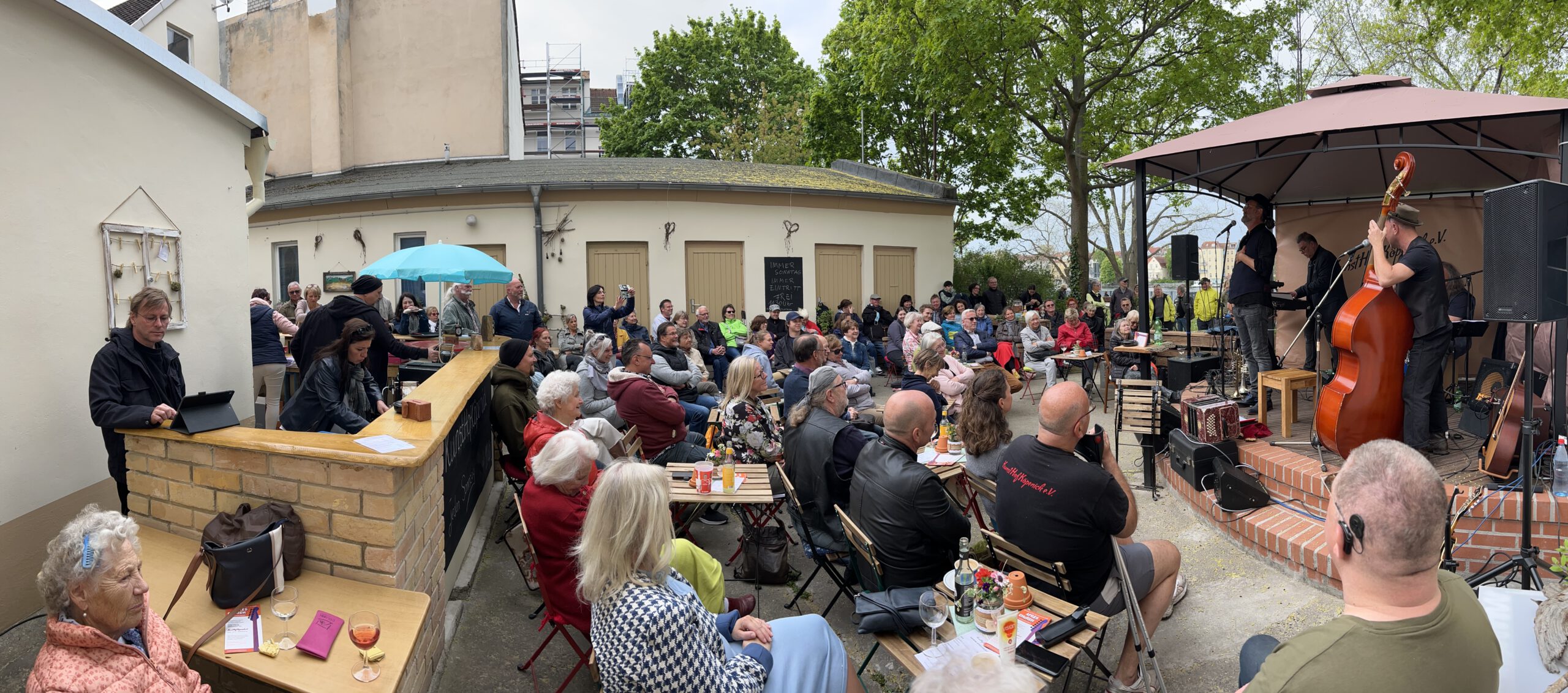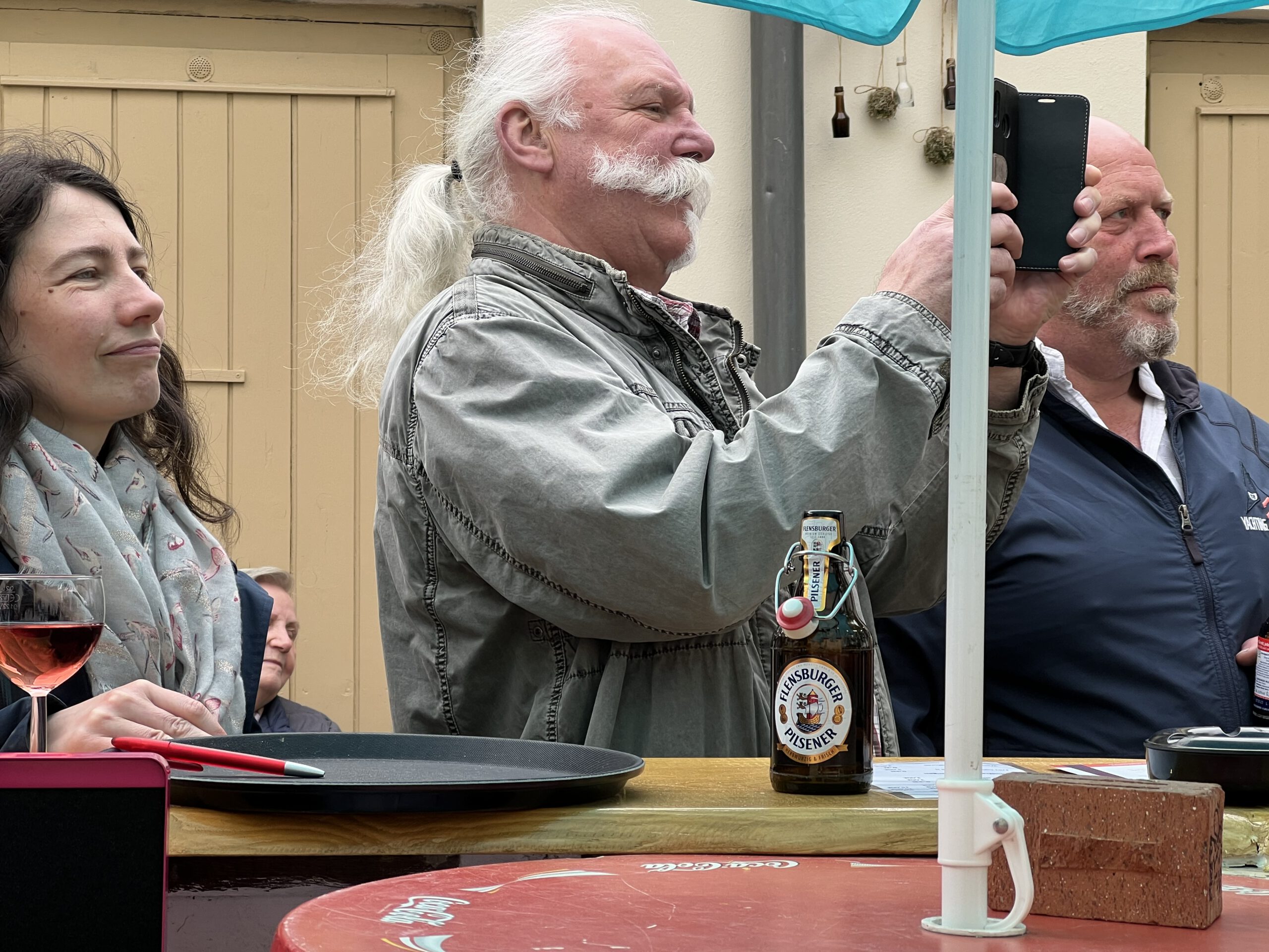 Und so dauerte es denn auch nicht lange, und unser wie üblich gut gefüllter Hof war am toben! Kurzweil, markant pointierter Humor und musikalisch-handwerkliche Perfektion waren das Geheimnis dieses durchweg gelungenen Sonntags. Auch Seidels vermeintliches Lampenfieber wurde, so es denn vorhanden war, professionell kaschiert, und das gar im Angesicht der eigens zum Event delegierten Dorfabordnung (welche die Kapelle zum Ende gar mit einem reichhaltigen Sortiment nahrhafter Wurstprodukte beschenken sollte).