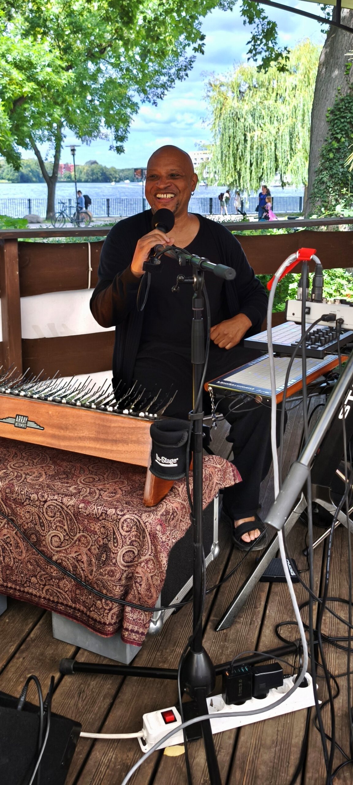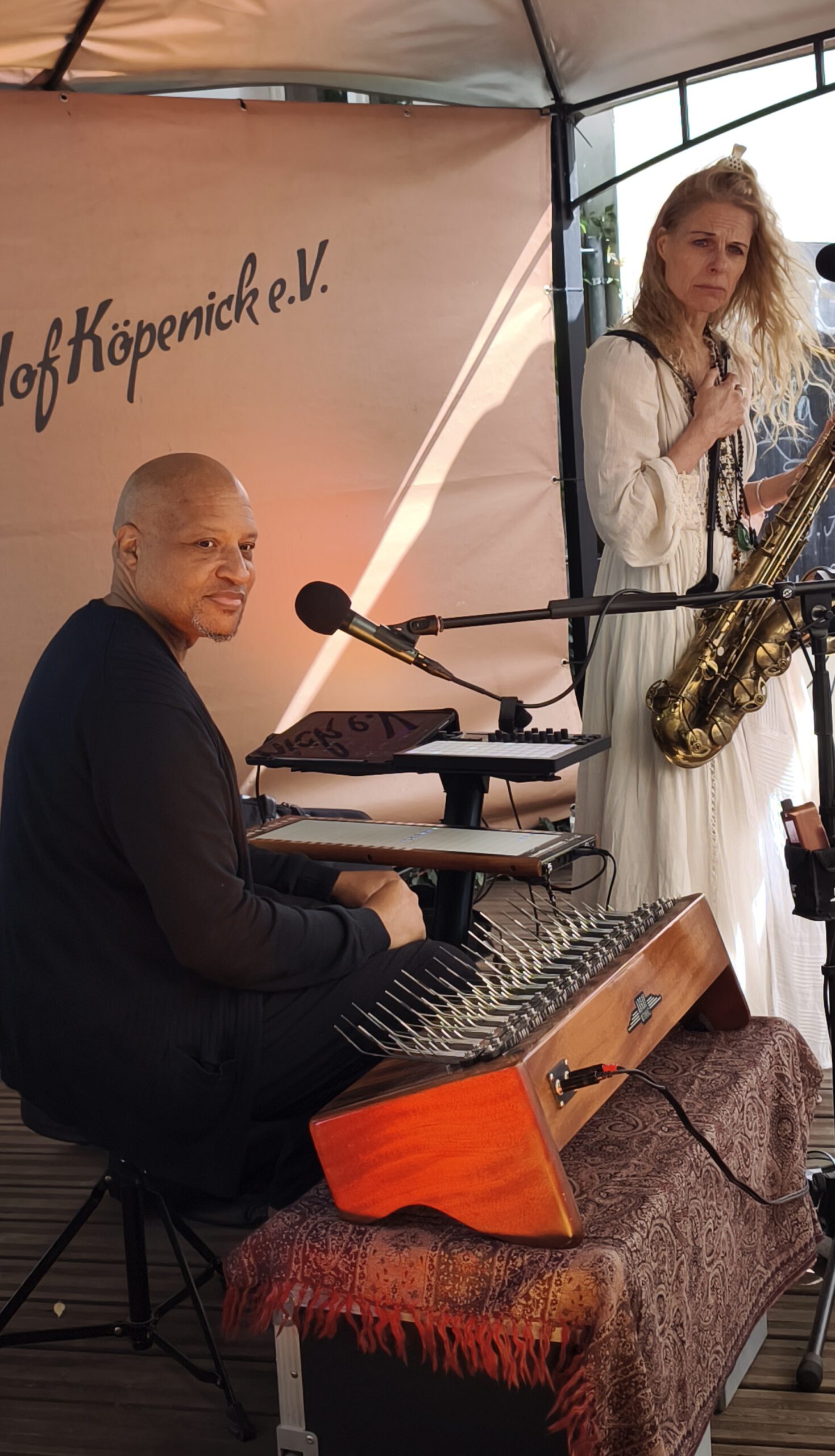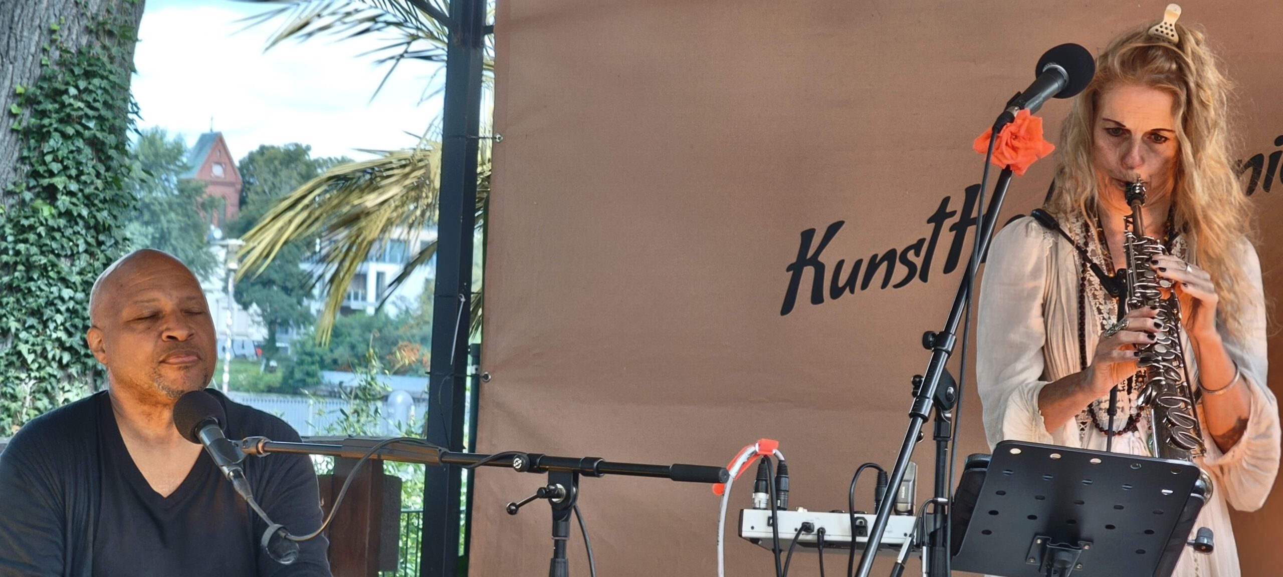 kamen jedenfalls zum Glück noch in Schwingung und verteilten sich über den KunstHof. Die warme Stimme von Fontaine, sein ungewöhnliches Instrumentarium, die beiden Saxophone von Marubia, oder auch der gemeinsame Gesang der beiden. Wenn es dann fließt, dann fließt es auch und berührt.