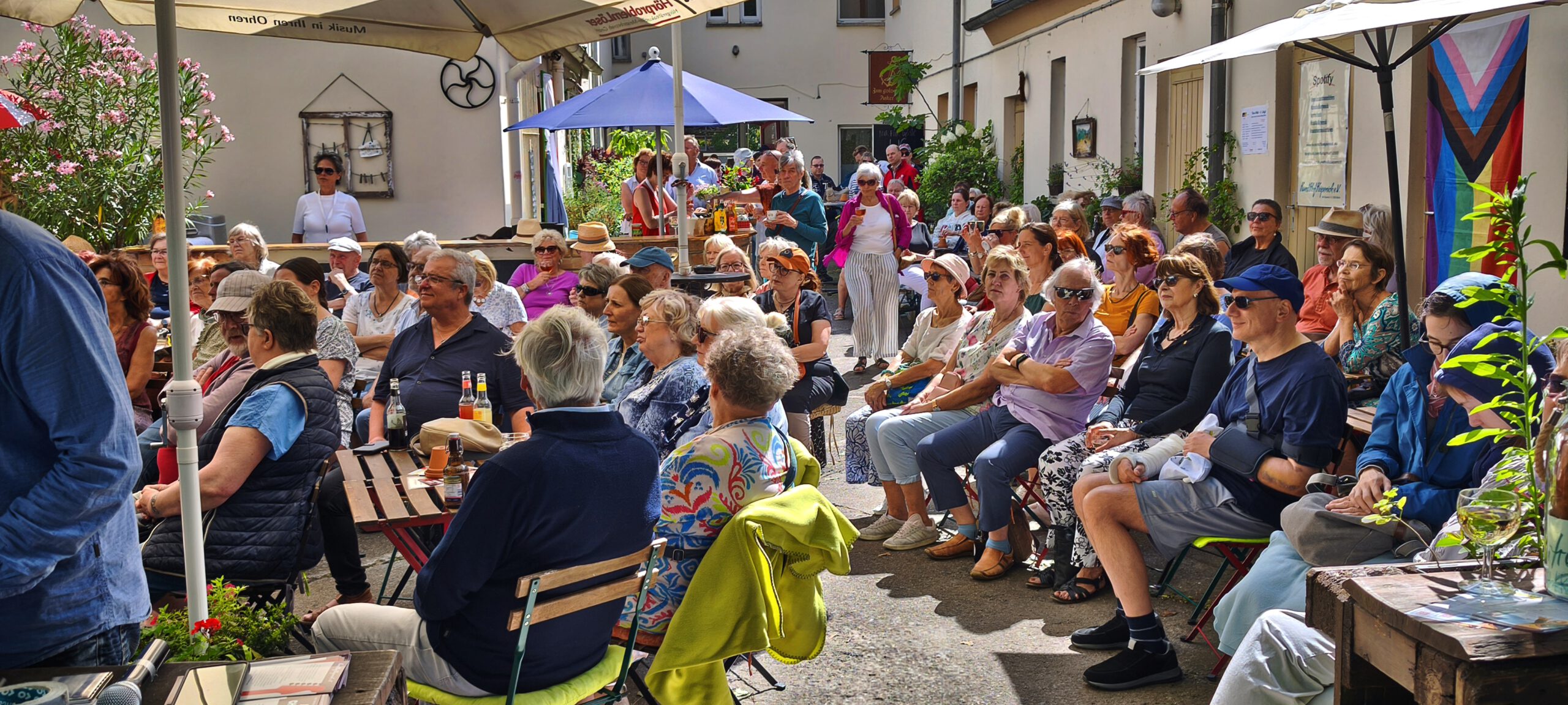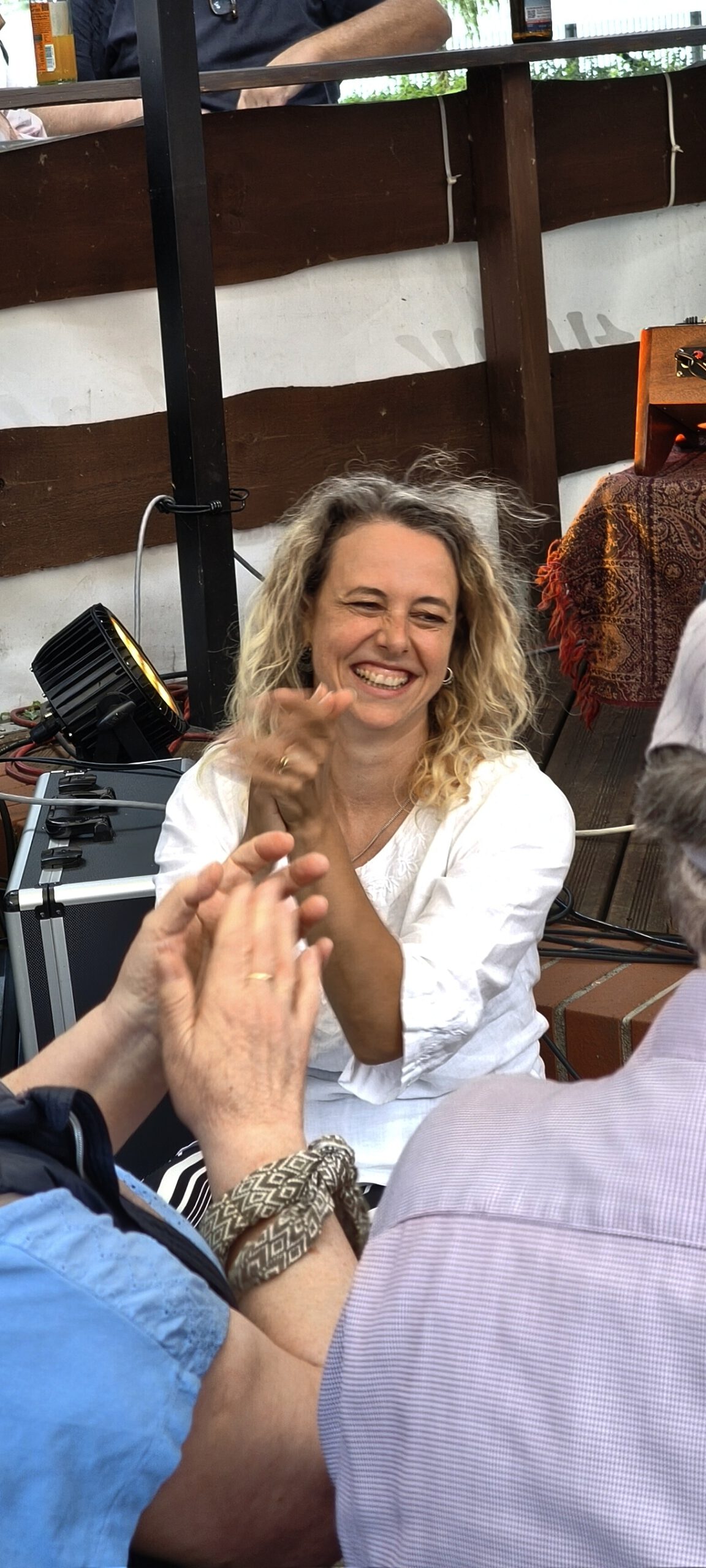 an alle. Zuvorderst an Fontaine, der das ruhig überspielte, hier mal ein gesungenes Lied oder eine Geschichte über seine Kindheit, seine Mutter oder „tote Katzen“ einstreute und das ganze Geschehen auf der Bühne charmant zusammenhielt. An Marubia, die zusätzlich zu dem Stress noch Probleme mit den Blättchen zu überspielen hatte, denn man soll es nicht meinen, Bläser haben dann doch Probleme mit Wind, jedenfalls wenn sie Blättchen benutzen und keine Mundstücke, wie Blechbläser. Und ein wenig windig war es schon trotz der schönen Sonne. Ein Kompliment an das Team, UND…das größte Kompliment gilt unserem Publikum, was trotz Allem interessiert und zugewandt bei der Sache blieb. Chapeau!