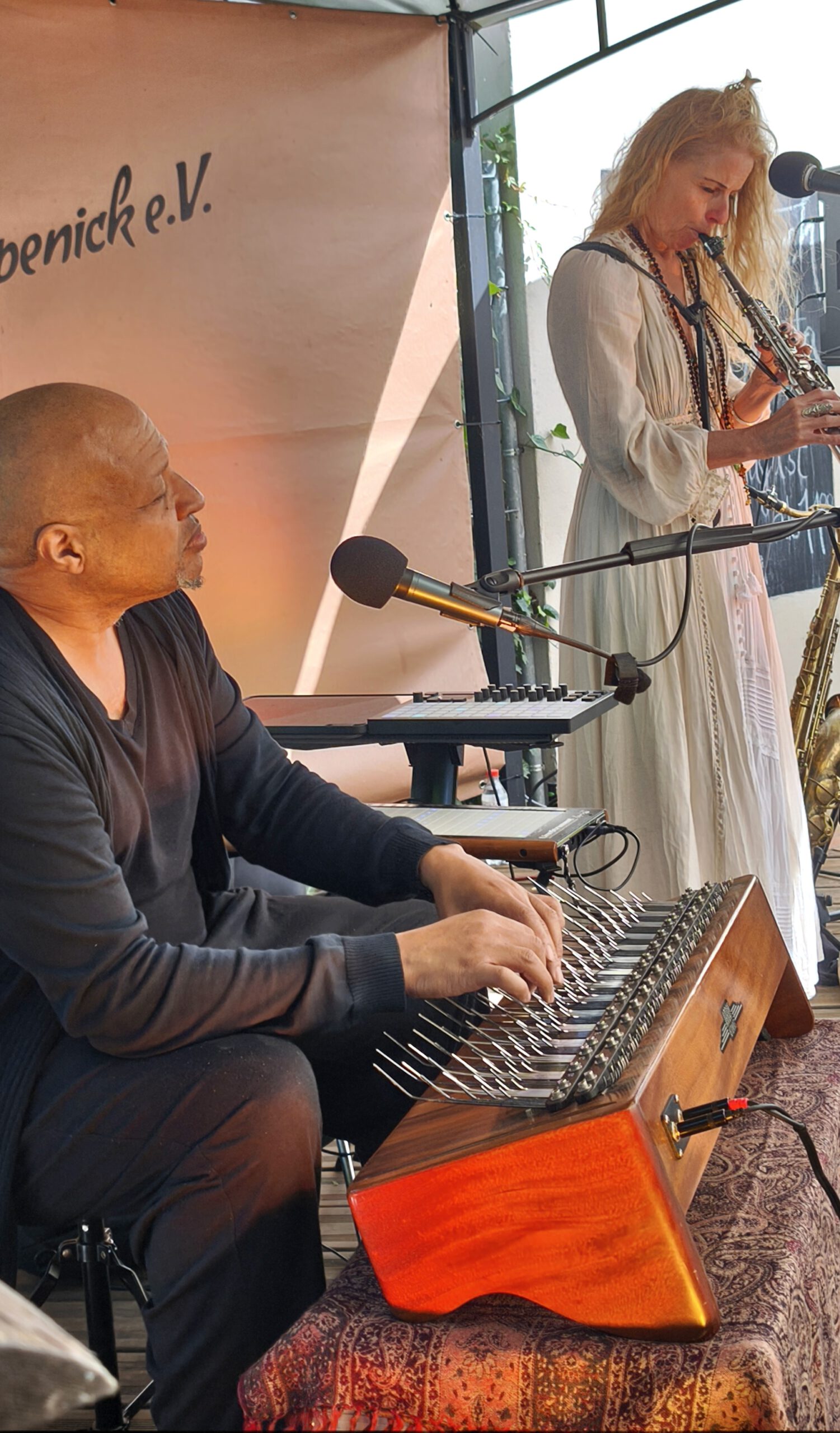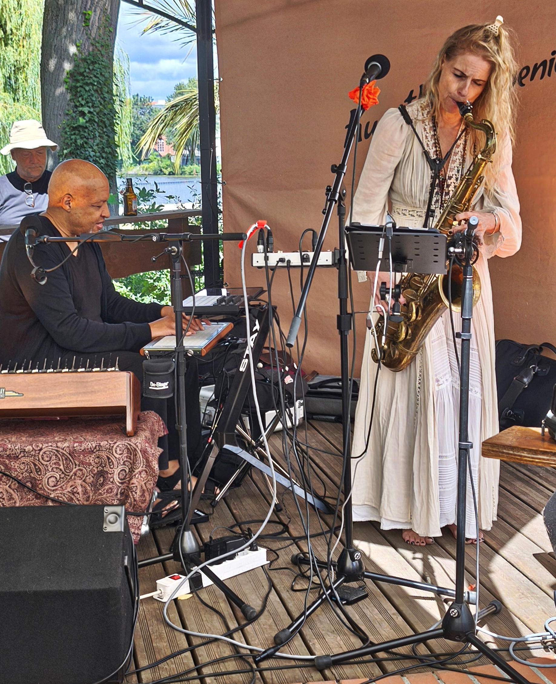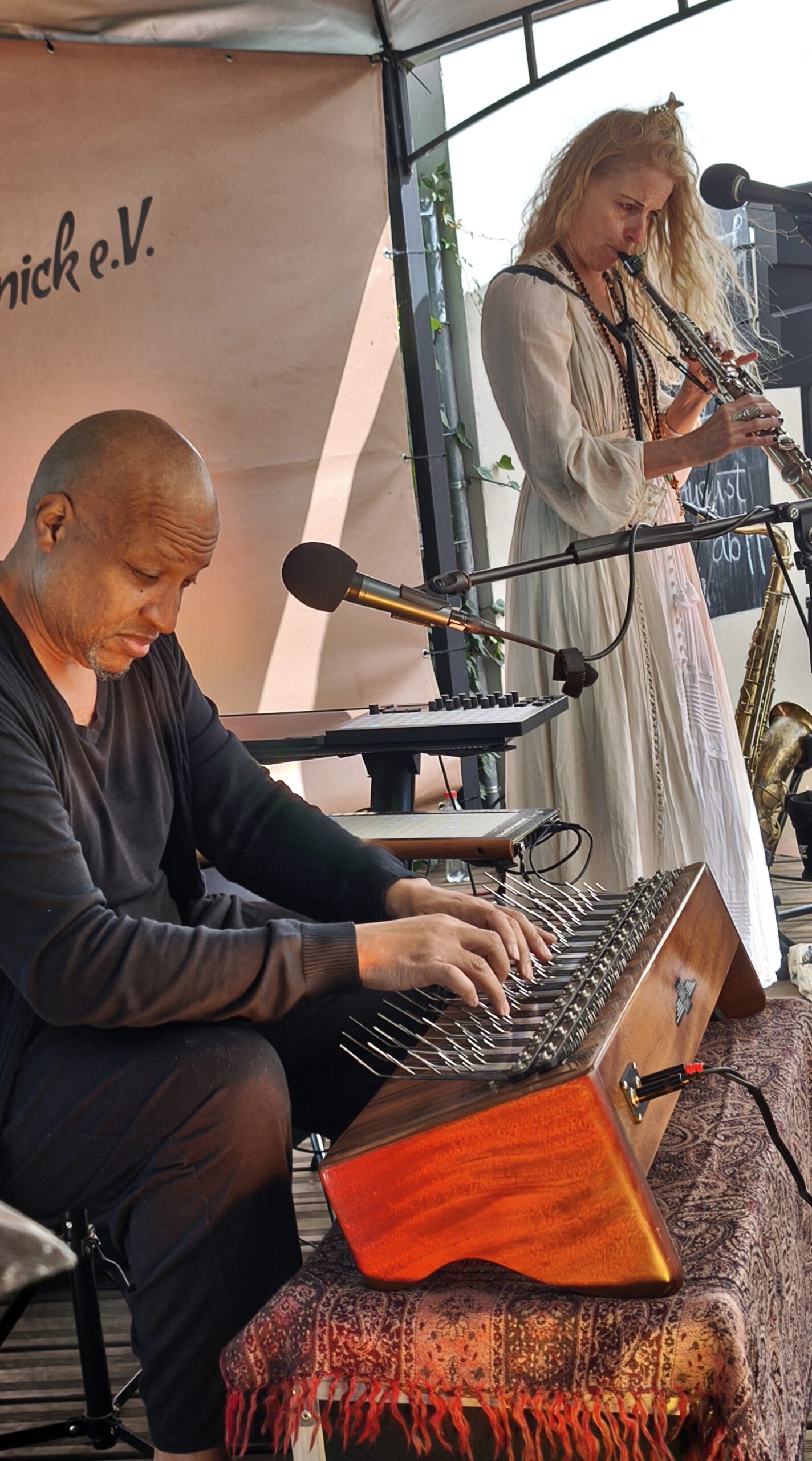 zu erhaschen gab und dann ging dieser aufregende lösungsbehaftete Vormittag dem Ende entgegen, einige Publikümmer holten sich noch Informationen bei Kalá Kýmata zum Beispiel zum Instrumentarium von Fontaine, also dem Linninstrument und dem Array Mbia, oder dazu was für Saxophone Marubia nun genau spielt, also Tenor und Sopran waren es heute, oder dazu wann das gemeinsame Album erscheint, musste man doch beim Kaufen auf getrennte CDs der beiden zurückgreifen. Das Team war währenddessen mit dem Rückbau des Hofes befasst und während sich Fontaine und Marubia dann auf den Weg nach Tschechien zu einem Festival machten, ließ das Team den Tag in der Grünstraße bei Sonne, Speis und Trank gemeinsam ausklingen.