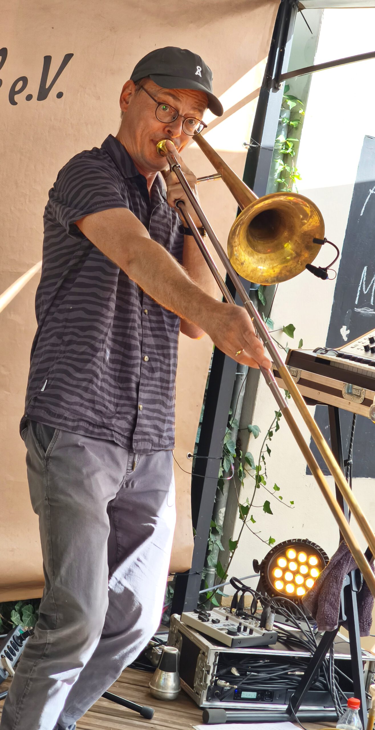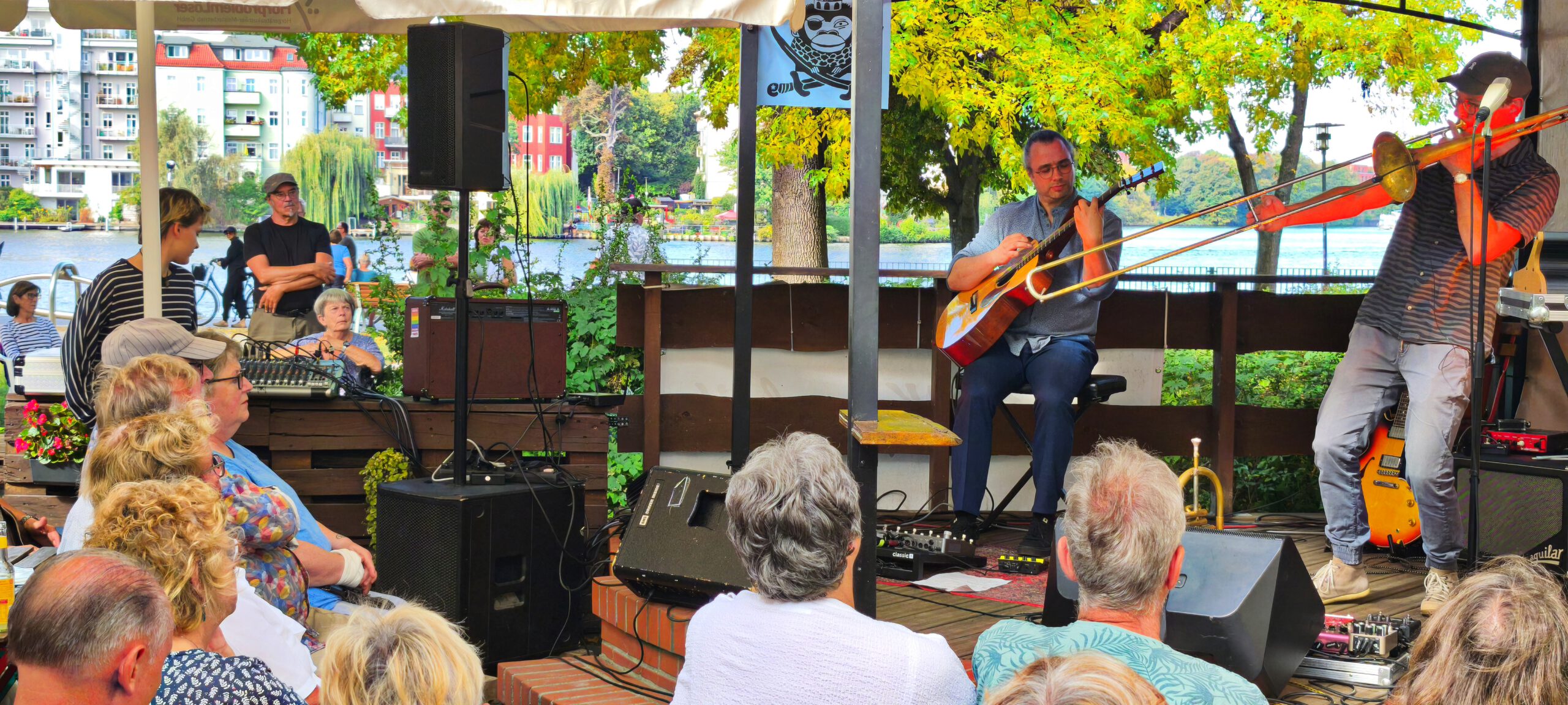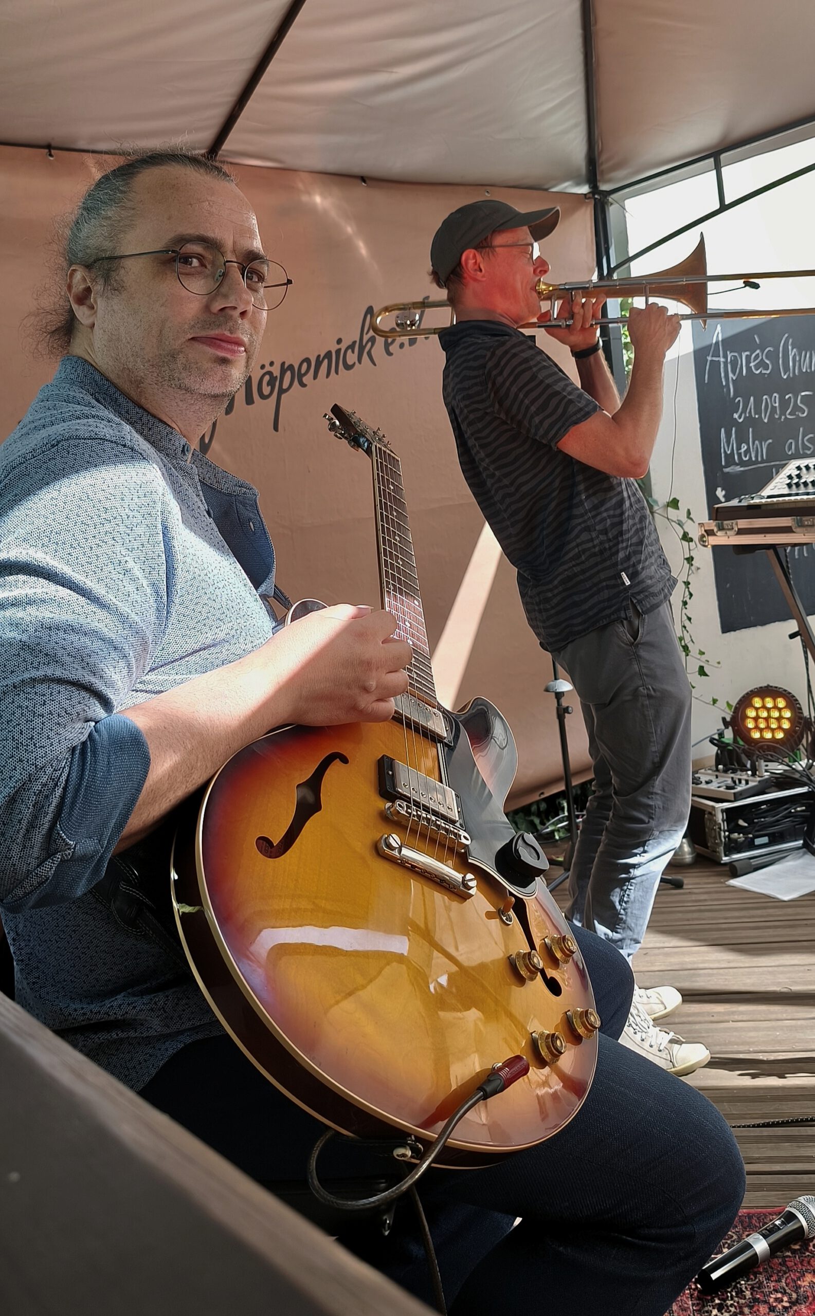 Und dann ging es auch schon los. Mehr ALS WIR enterten die Bühne mit Akustikgitarre und Posaune und Stompbox und Flügelhorn und Loopstations und was sie sonst noch alles an tongebenden Instrumenten so finden konnten und schon Aristoteles wusste: „Das Ganze ist mehr als die Summe seiner Teile “, und „MEHR ALS WIR“ ist eben mehr als nur zwei Musiker und nur Instrumentalmusik.
