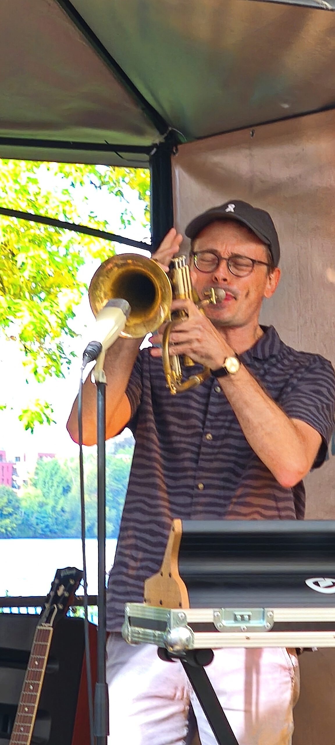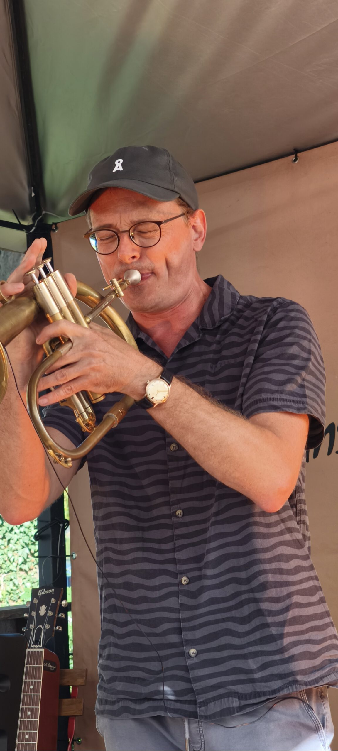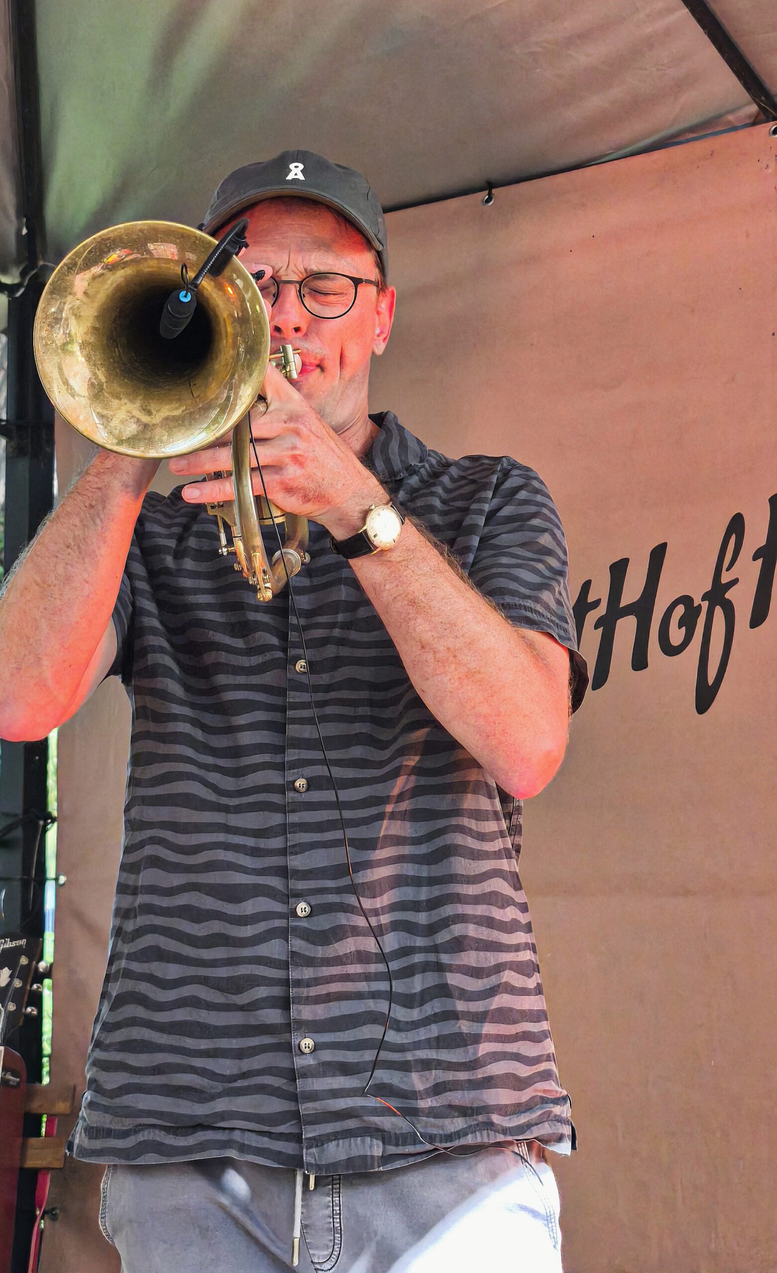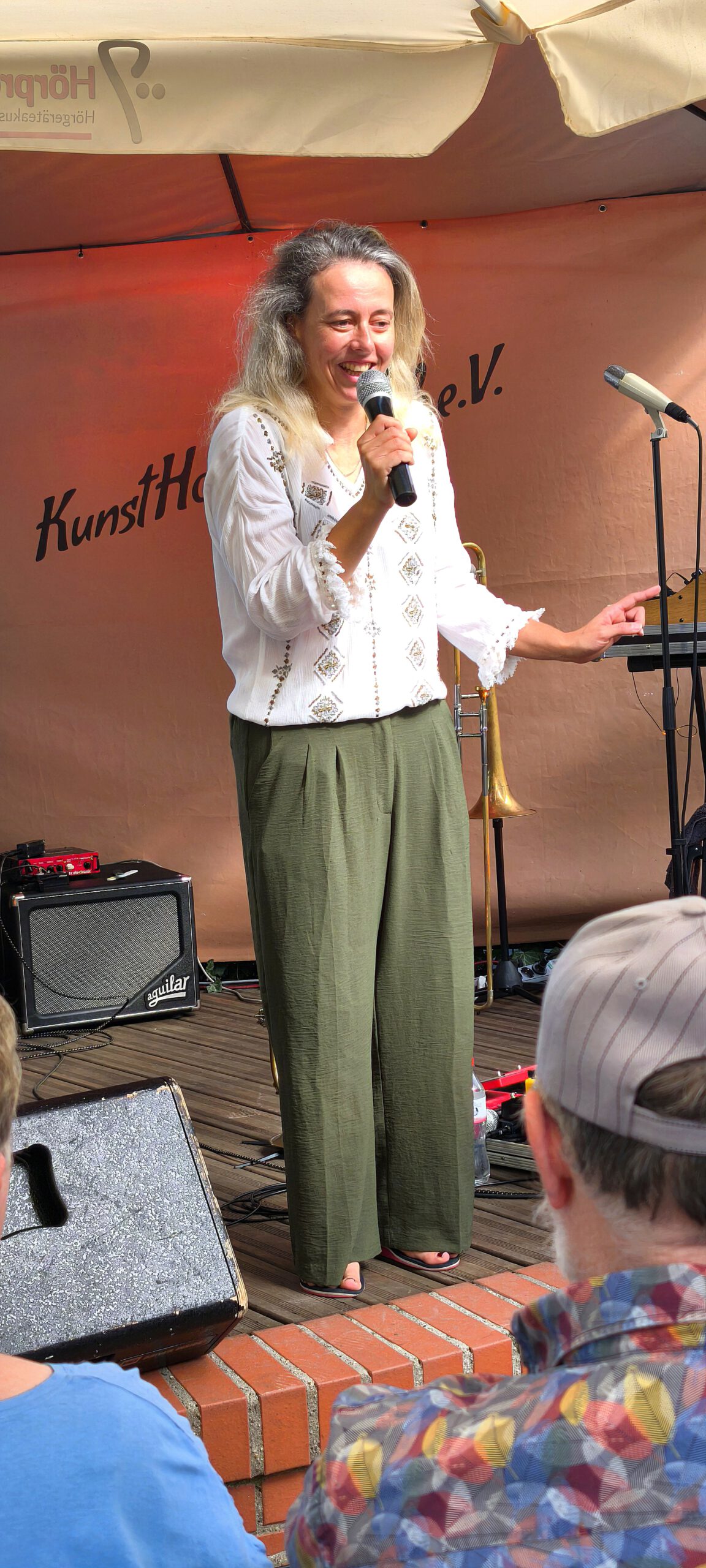 Und dann ging es auch schon los. Mehr ALS WIR enterten die Bühne mit Akustikgitarre und Posaune und Stompbox und Flügelhorn und Loopstations und was sie sonst noch alles an tongebenden Instrumenten so finden konnten und schon Aristoteles wusste: „Das Ganze ist mehr als die Summe seiner Teile “, und „MEHR ALS WIR“ ist eben mehr als nur zwei Musiker und nur Instrumentalmusik.