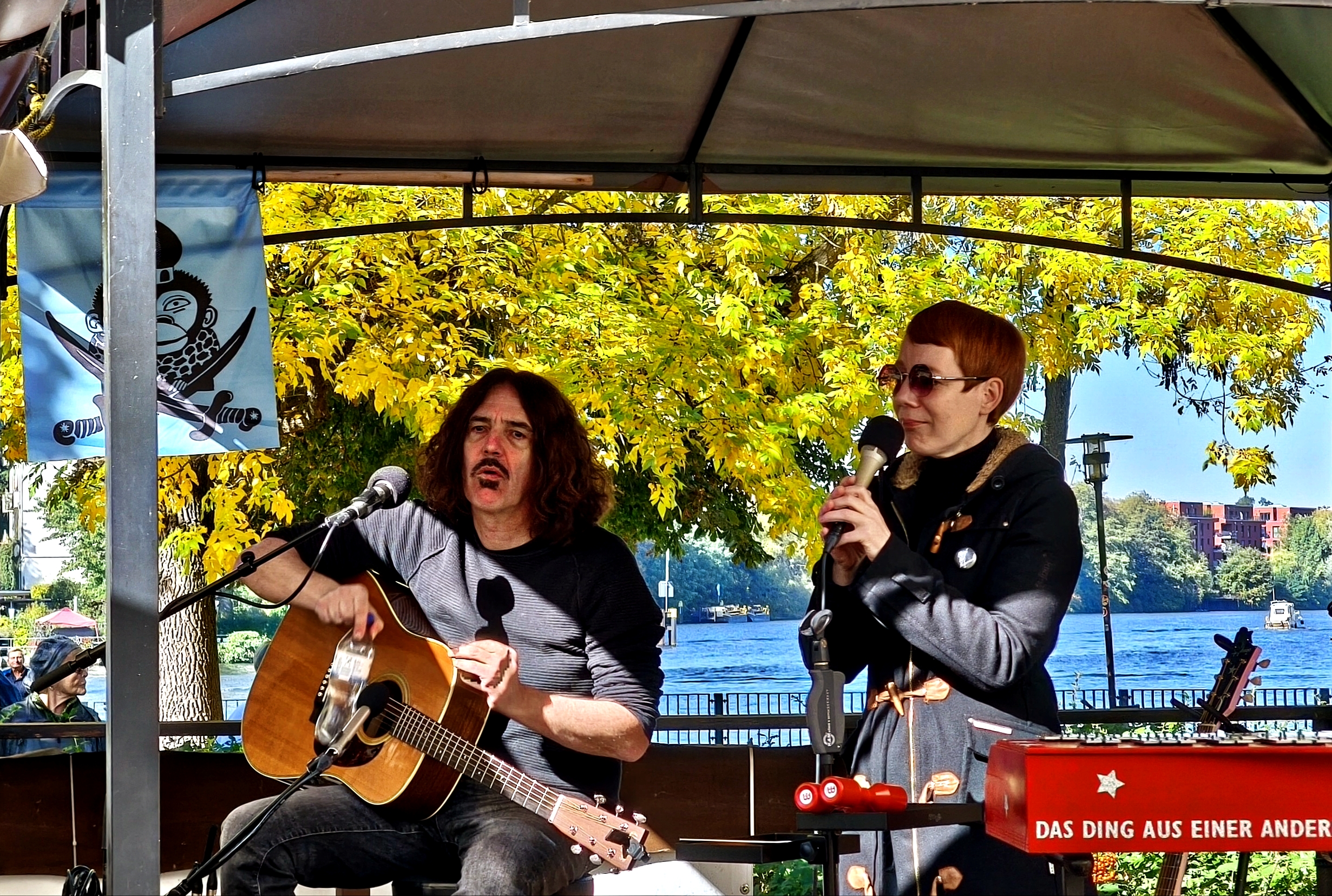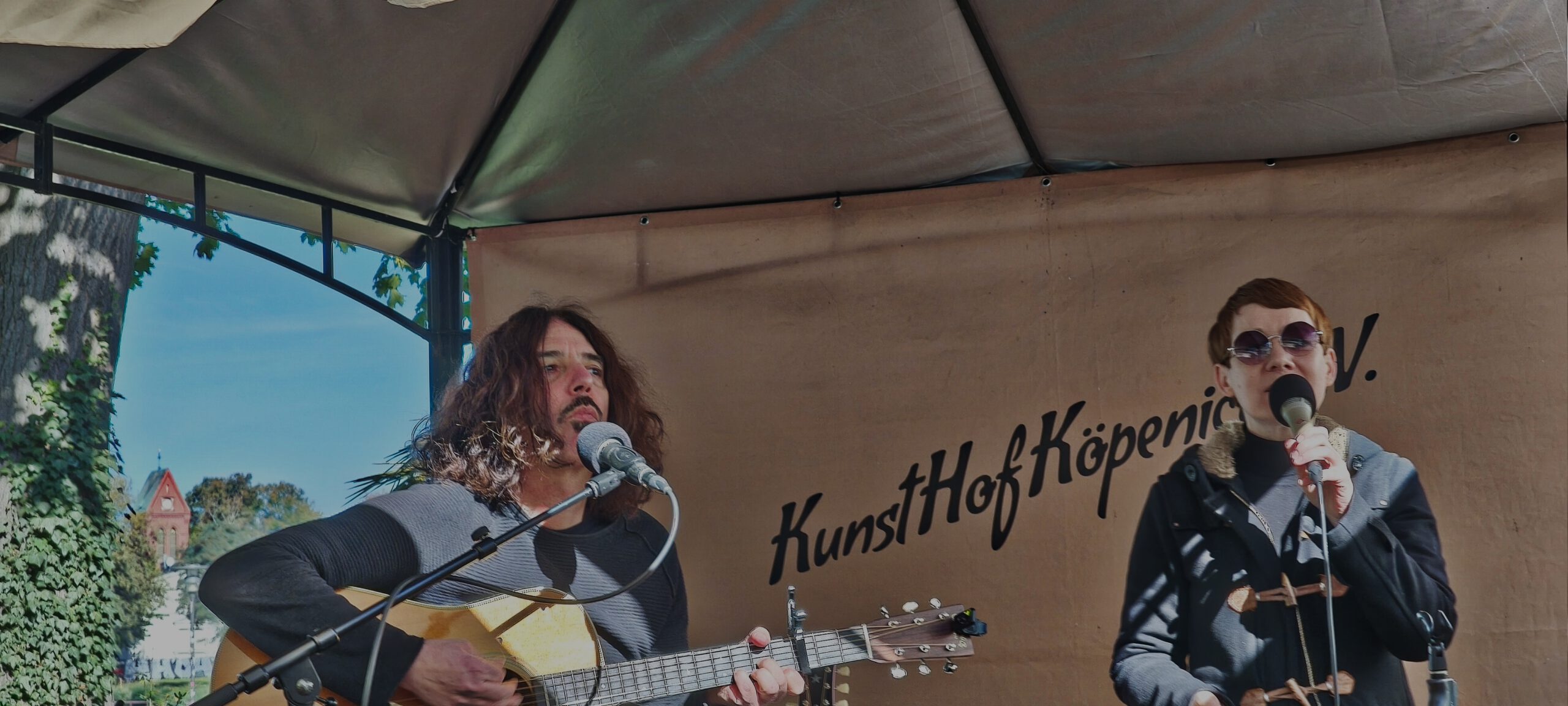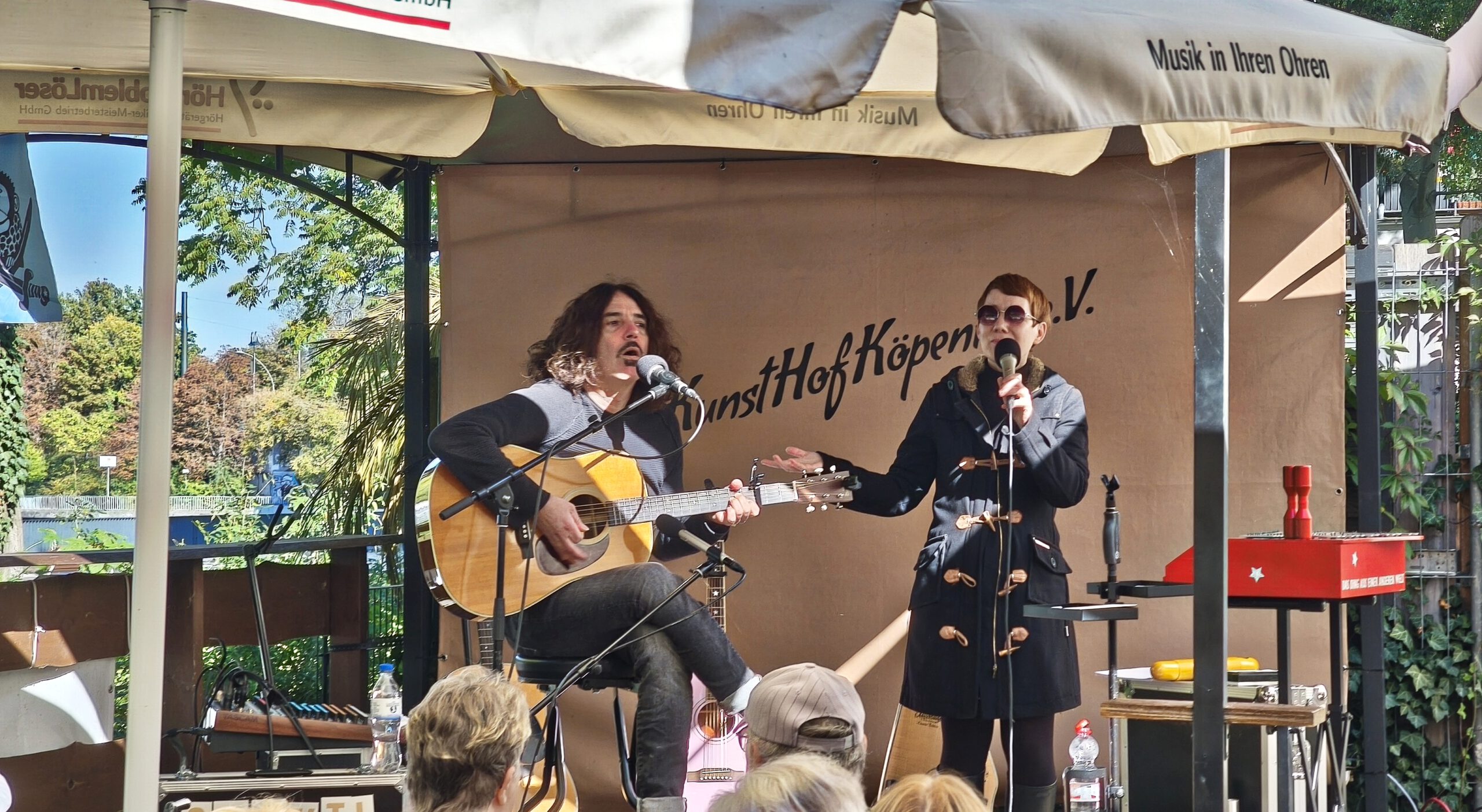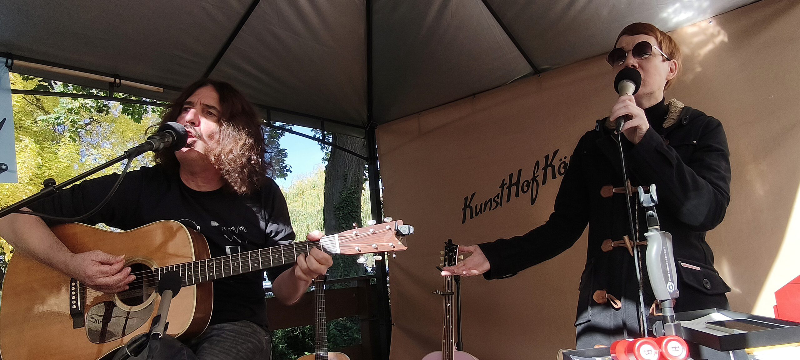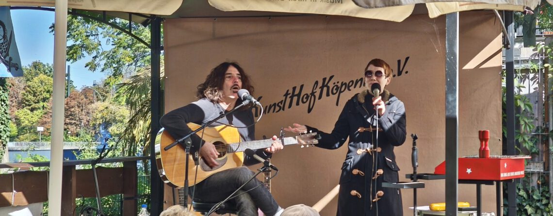 Damit sollte das Konzert von Shakti & Matze auf dem KunstHofKöpenick heute starten. Wie wir alle wissen, ist eine Plattitüde laut Definition eine belanglose Aussage und wir können es als absolutes Understatement der beiden Protagonisten des heutigen Vormittags werten, so zu starten, denn….belanglose Aussagen kann man den beiden, die ihre Lieder zumeist im Winter am Küchentisch schreiben, nun wirklich nicht vorhalten. Im Gegenteil! Immer unterhaltsam, immer ohne Zeigefinger und sehr humorig bringen die beiden ihre Geschichten zu Gehör, die so oder so ähnlich auch unsere sein könnten. Und das ist nicht alles, das ganze würzen sie mit einer klaren Dramaturgie, die sicher der jahrelangen Erfahrung der Kleinkunstbühnen dieser Republik entspringt. Mich freut so etwas immer sehr, wenn nicht lediglich die Lieder abgespielt werden, sondern der Kontakt mit dem Publikum gesucht wird, auch über kleine aber sehr feine Ideen zu den Liedern. In An- und/oder Absagen oder auch währenddessen. Und das freut nicht nur mich, sondern das ganze Publikum. Schon bei der charmanten Eröffnung durch Shakti waren also alle mit im Boot und ganz Ohr.