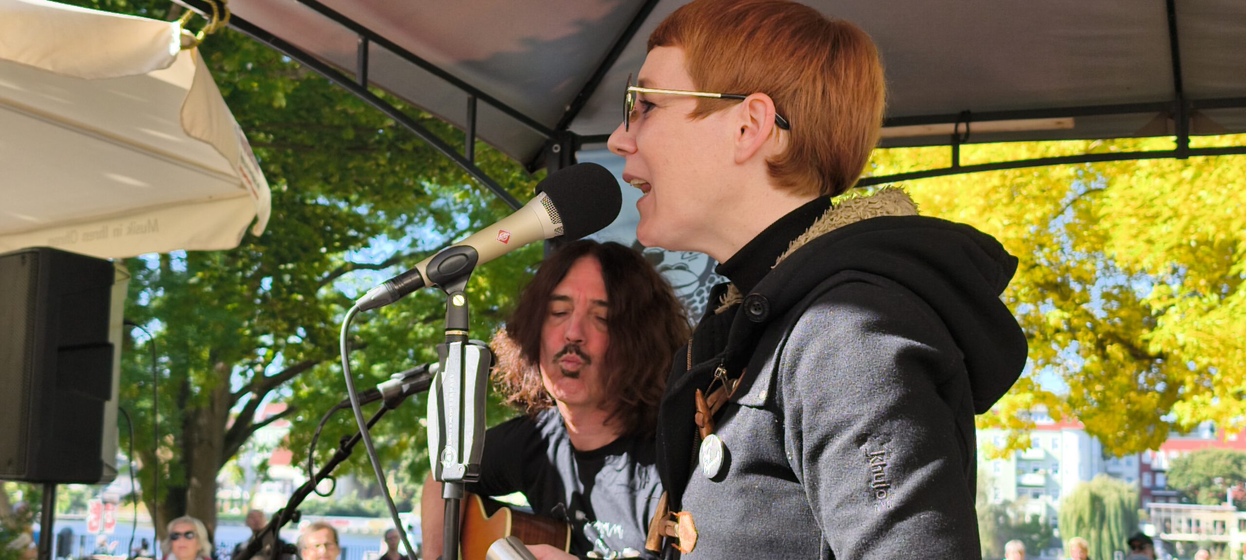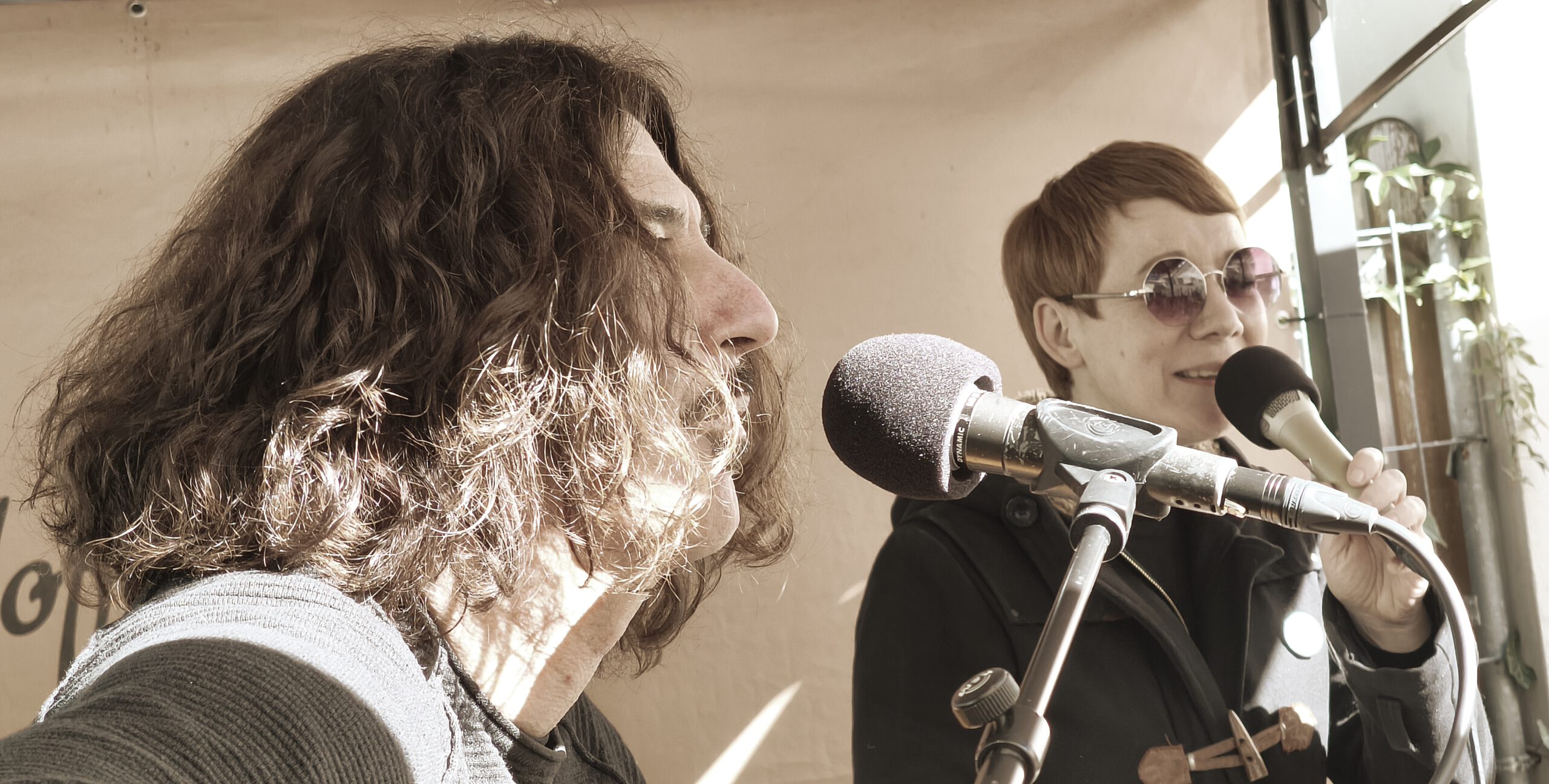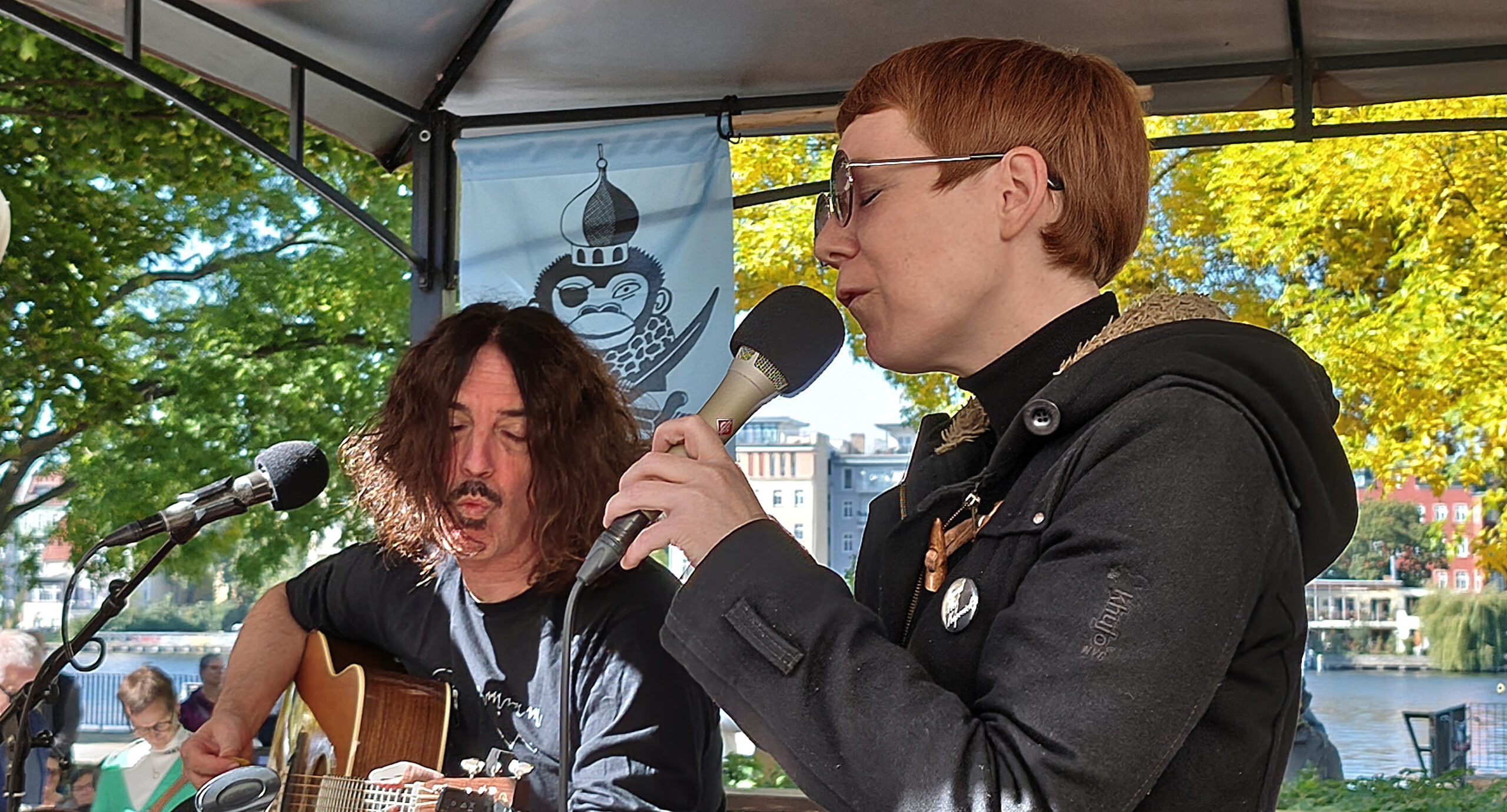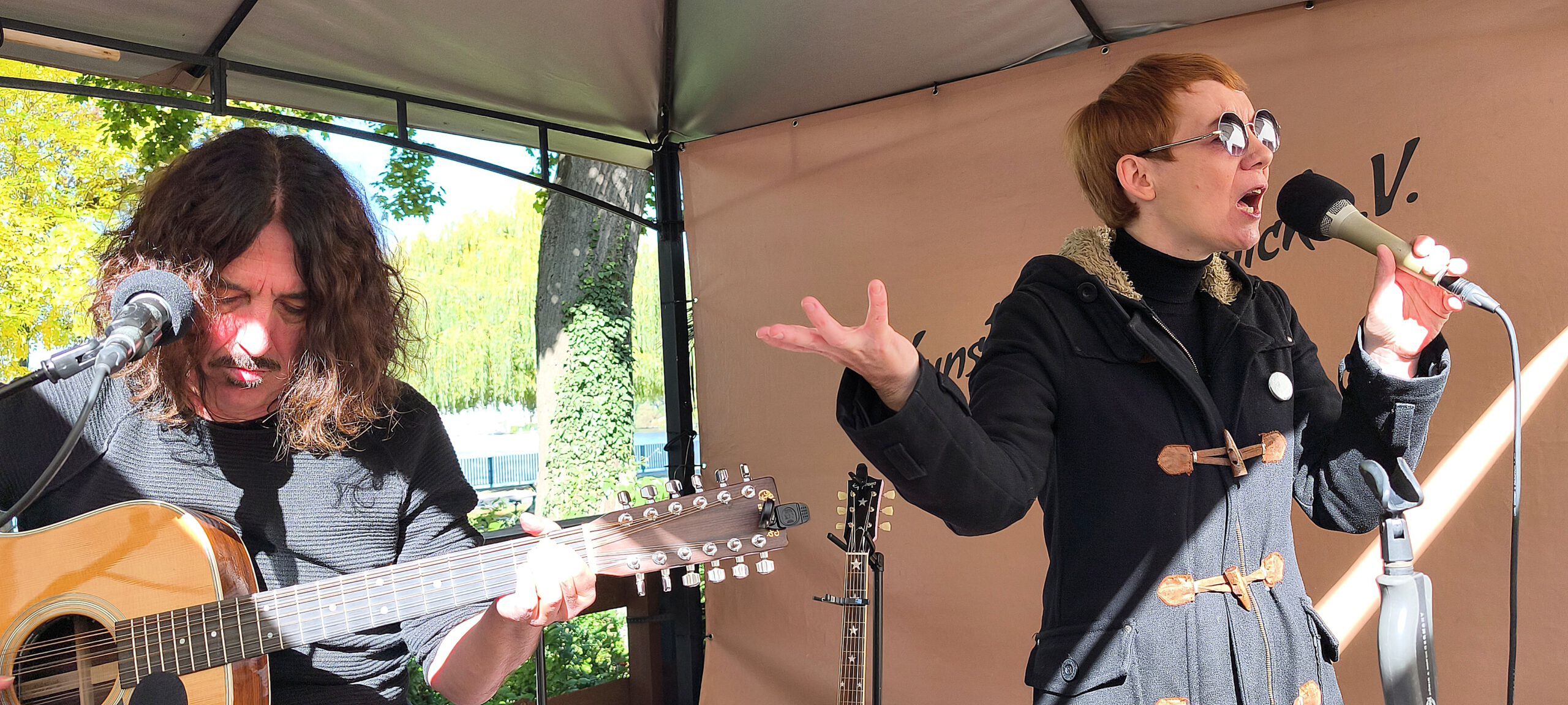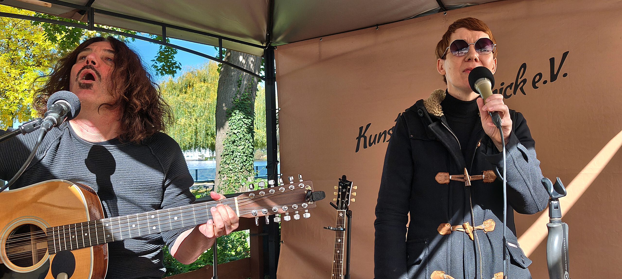 Damit sollte das Konzert von Shakti & Matze auf dem KunstHofKöpenick heute starten. Wie wir alle wissen, ist eine Plattitüde laut Definition eine belanglose Aussage und wir können es als absolutes Understatement der beiden Protagonisten des heutigen Vormittags werten, so zu starten, denn….belanglose Aussagen kann man den beiden, die ihre Lieder zumeist im Winter am Küchentisch schreiben, nun wirklich nicht vorhalten. Im Gegenteil! Immer unterhaltsam, immer ohne Zeigefinger und sehr humorig bringen die beiden ihre Geschichten zu Gehör, die so oder so ähnlich auch unsere sein könnten. Und das ist nicht alles, das ganze würzen sie mit einer klaren Dramaturgie, die sicher der jahrelangen Erfahrung der Kleinkunstbühnen dieser Republik entspringt. Mich freut so etwas immer sehr, wenn nicht lediglich die Lieder abgespielt werden, sondern der Kontakt mit dem Publikum gesucht wird, auch über kleine aber sehr feine Ideen zu den Liedern. In An- und/oder Absagen oder auch währenddessen. Und das freut nicht nur mich, sondern das ganze Publikum. Schon bei der charmanten Eröffnung durch Shakti waren also alle mit im Boot und ganz Ohr.
