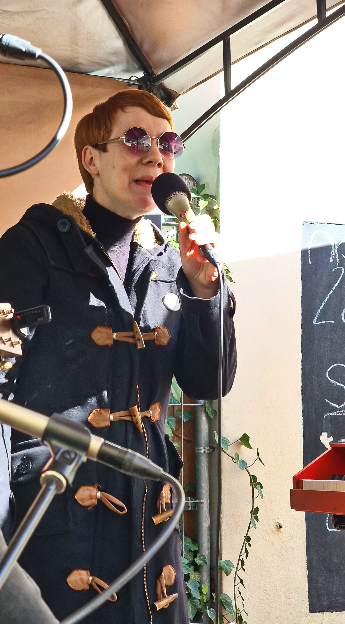 ist es jedenfalls, dass wir unser schönes Köpenick wieder auf allen Wegen barrierefrei erreichen können und wir hoffen sehr, dass wir das überhaupt noch alle erleben. 😉 Zukunftsmusik war aber auch der letzte Song im Set, doch zuvor erklomm, wie (fast) immer der Onkel mit der Laterne Tobias die Bühne, der ja berufsbedingt eine Woche aussetzen musste und sichtlich gut gelaunt darüber war, wieder im Kreise seiner Lieben einem Konzert lauschen zu können. Natürlich wurde unser Konzept des „Einer-trage-des-anderen-Last“ erklärt, dem wunderbaren Team mit dem Kunsthofspezifischen kurzen Applaus gedankt, die Geldsammel“kinder“ Anna, Wilma und Hannes begrüßt, danke ihr Schnuffies und Danke Anna für die Hilfe an Bühne und Merch.