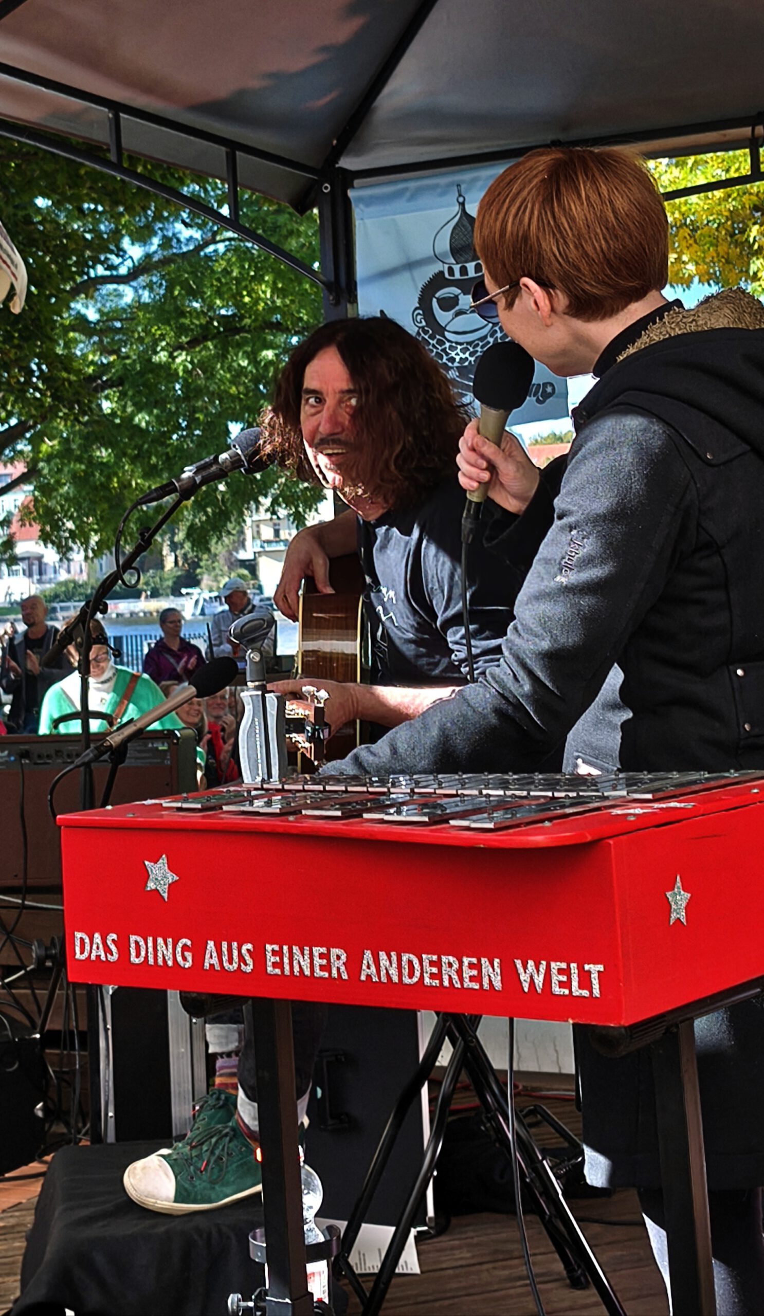 ändern sich eben manchmal die Dinge und alles ist anders, manchmal auch die Stimmung und man wacht z.B. grundlos schlecht gelaunt auf. Auch dafür muss es natürlich ein Lied geben, aber Shakti & Matze wären nicht Shakti & Matze, wenn sie nicht mit einem Kniff am Ende des Liedes wieder ein Lächeln auf den Hof zaubern könnten. Und womit? Mit einem weiteren vorhin kurz erwähnten „Instrument“, dem Stylophon. Ein wirklich grausiges Instrument, was wohl, zumindest in den gebrauchten Ländern, wir hatten ja nüscht 😉 ab 1967 unter vielen Weihnachtsbäumen lag und spätestens bis Silvester unter ungeklärten Umständen wieder verschwand, weil es zwar den Kindern viel Freud, den Eltern jedoch viel Leid brachte. Doch nun…ein Tipp von Shakti: Dieses Gerät gibt es nach längerer Pause wieder zu erwerben und wer Kinder in seinem Umfeld mag, die Eltern hingegen nicht so, der solle das doch gern verschenken. Die Einladungen der Eltern hören schlagartig auf und die Zuneigung der Kinder ist einem sicher. Ein Leben lang! Und mit einem Solo auf diesem STYLOPHON endete das Lied dann doch sehr versöhnlich.