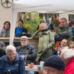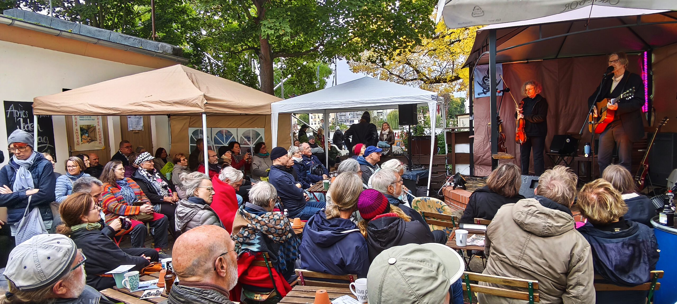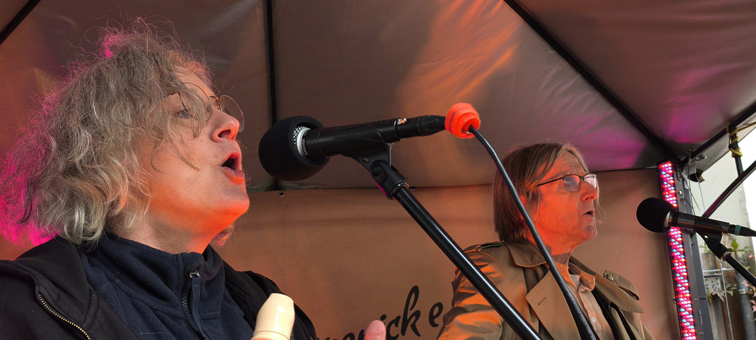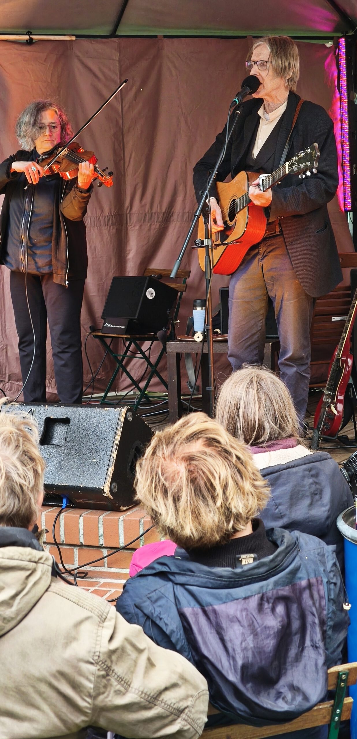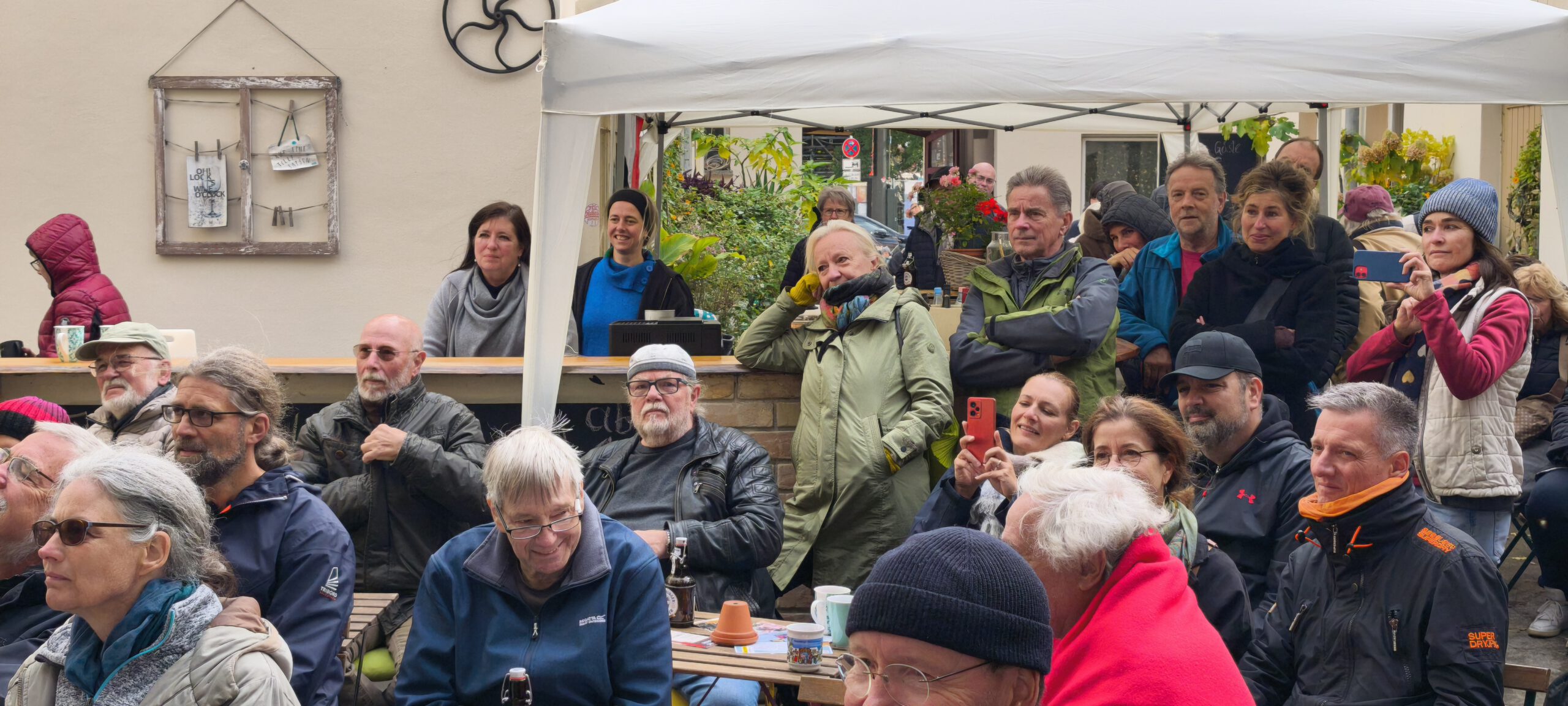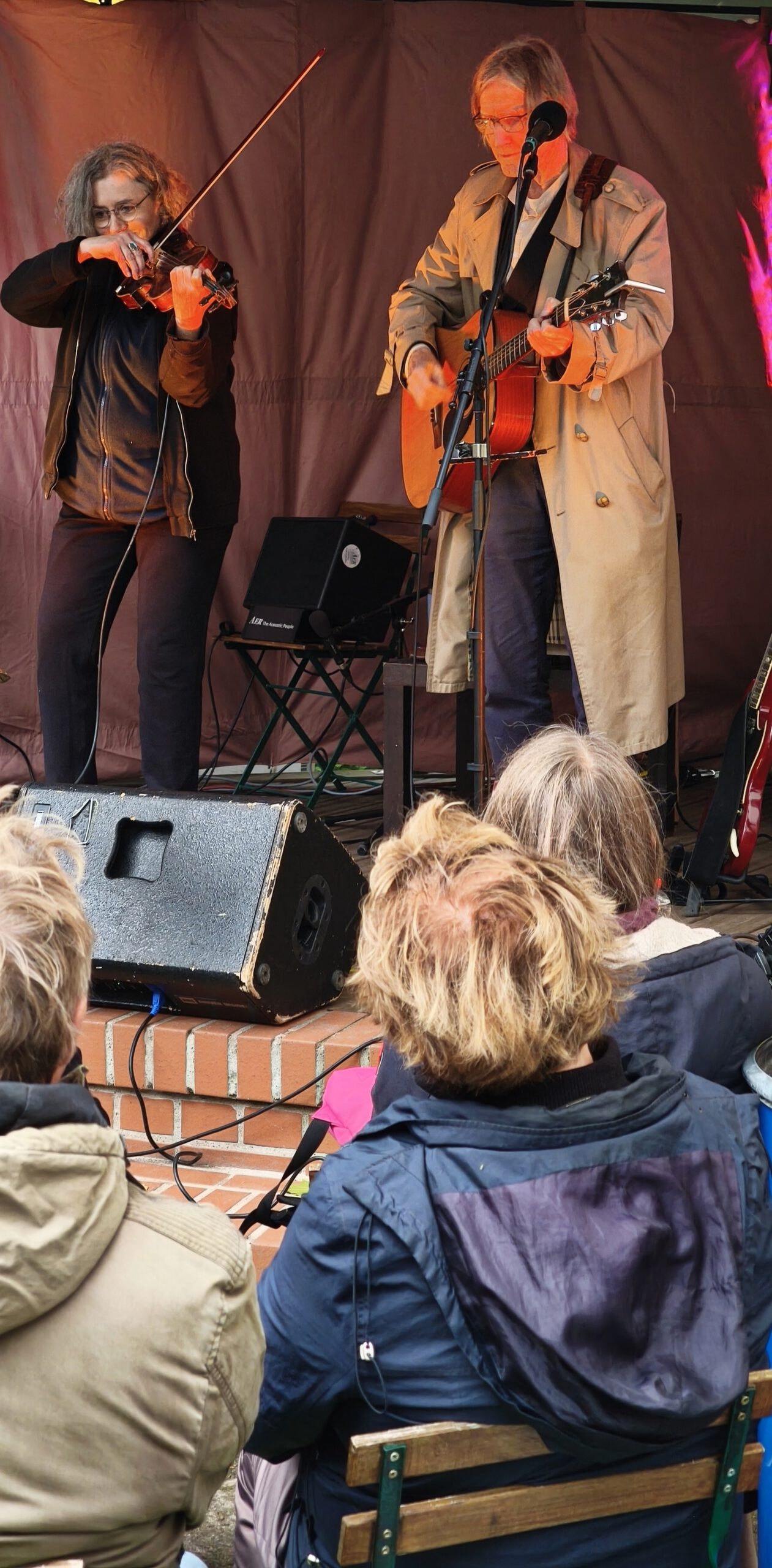 kein Lied über Köpenick, obwohl die hier auch rumjuckeln, aber doch ein Lied über die Schwierigkeit bei Regen und Wind mit einem solchen vorwärtszukommen. Und Regen und Wind ist ein gutes Stichwort. Ja…durchaus, es war etwas kühl heute, aber wie von Petrus zugesagt, regnete es NICHT, der Wind war mäßig, ab und zu brach sogar die Sonne durch. Das sah aber am Morgen wirklich noch nicht danach aus und wir ziehen wieder einmal alle Hüte vor unserem großartigen Publikum, welches dem Onkel mit der Laterne letzte Woche glaubte, der genau das versprach. Und hiermit setzen wir noch einen drauf und sagen: „Wat kost`die Welt, am nächsten Sonntag machen wir das einfach noch einmal genau so, also ohne Regen und mit unseren Decken und dem Glühwein und der vorgeheizten Bühne, gell Petrus? Läuft!“ Der Hof war also gut gefüllt, sogar Zaungäste waren wieder da und spätestens nach dem zweiten Lied hatte der Zauber unseres schönen Ortes auch Lüül und Kerstin gepackt.