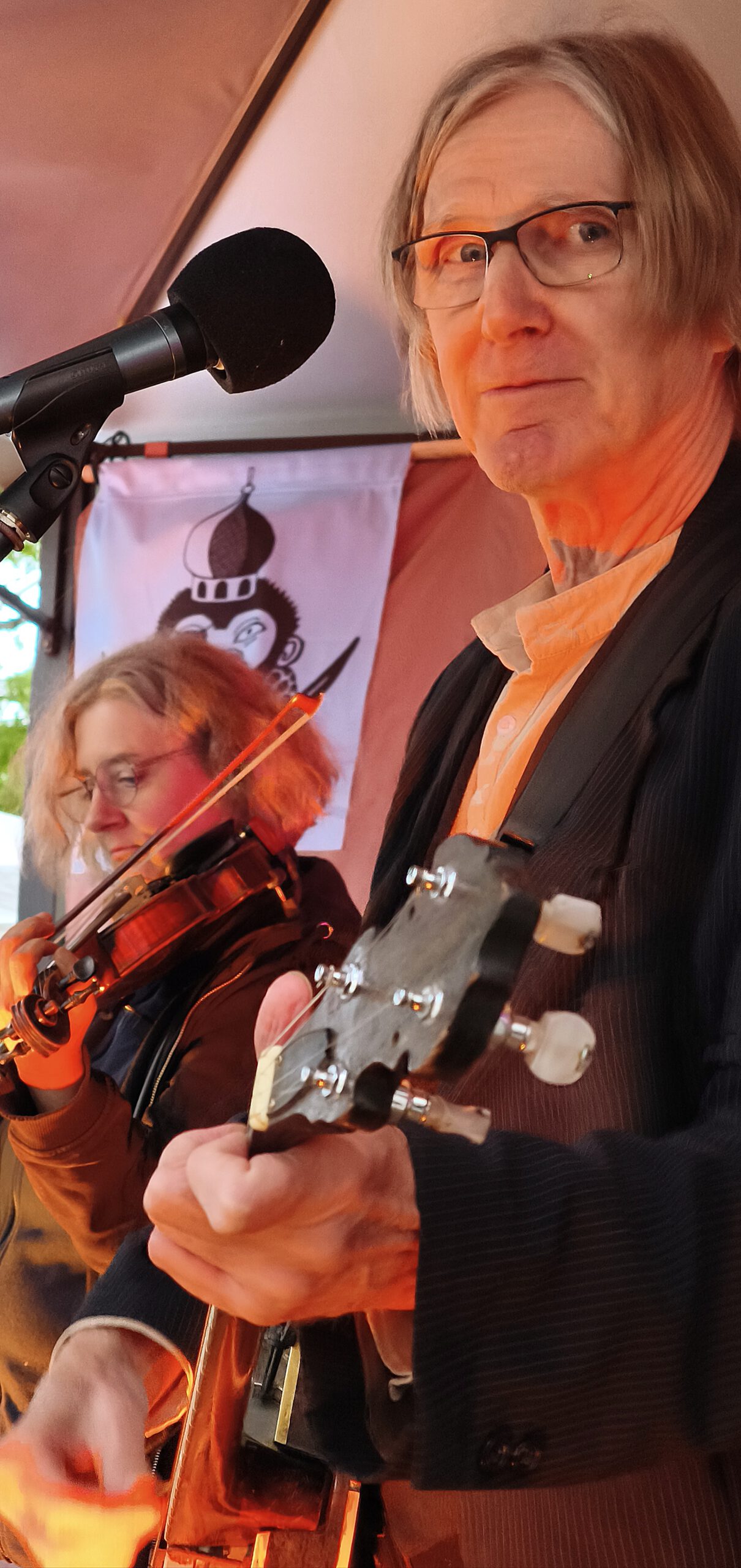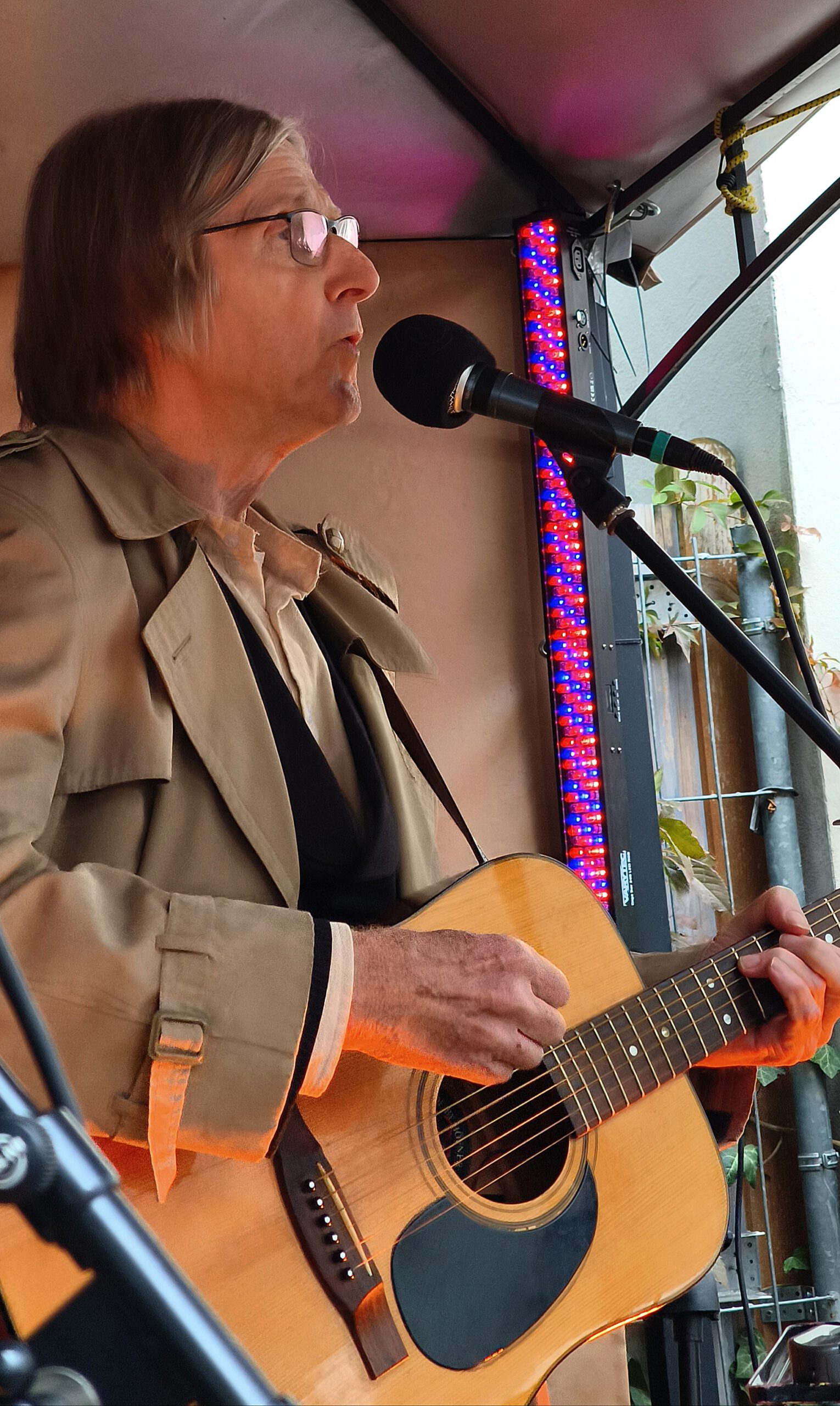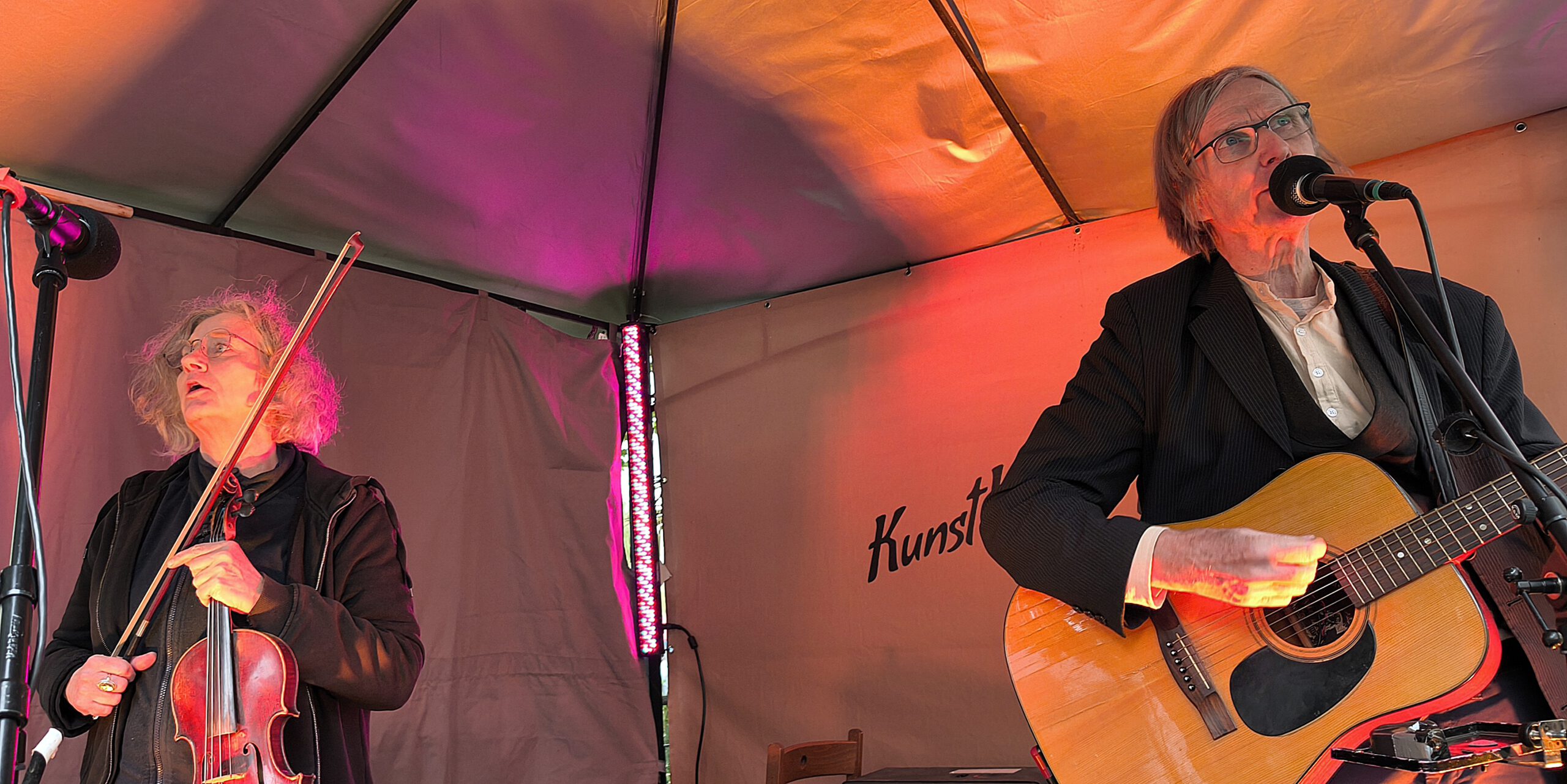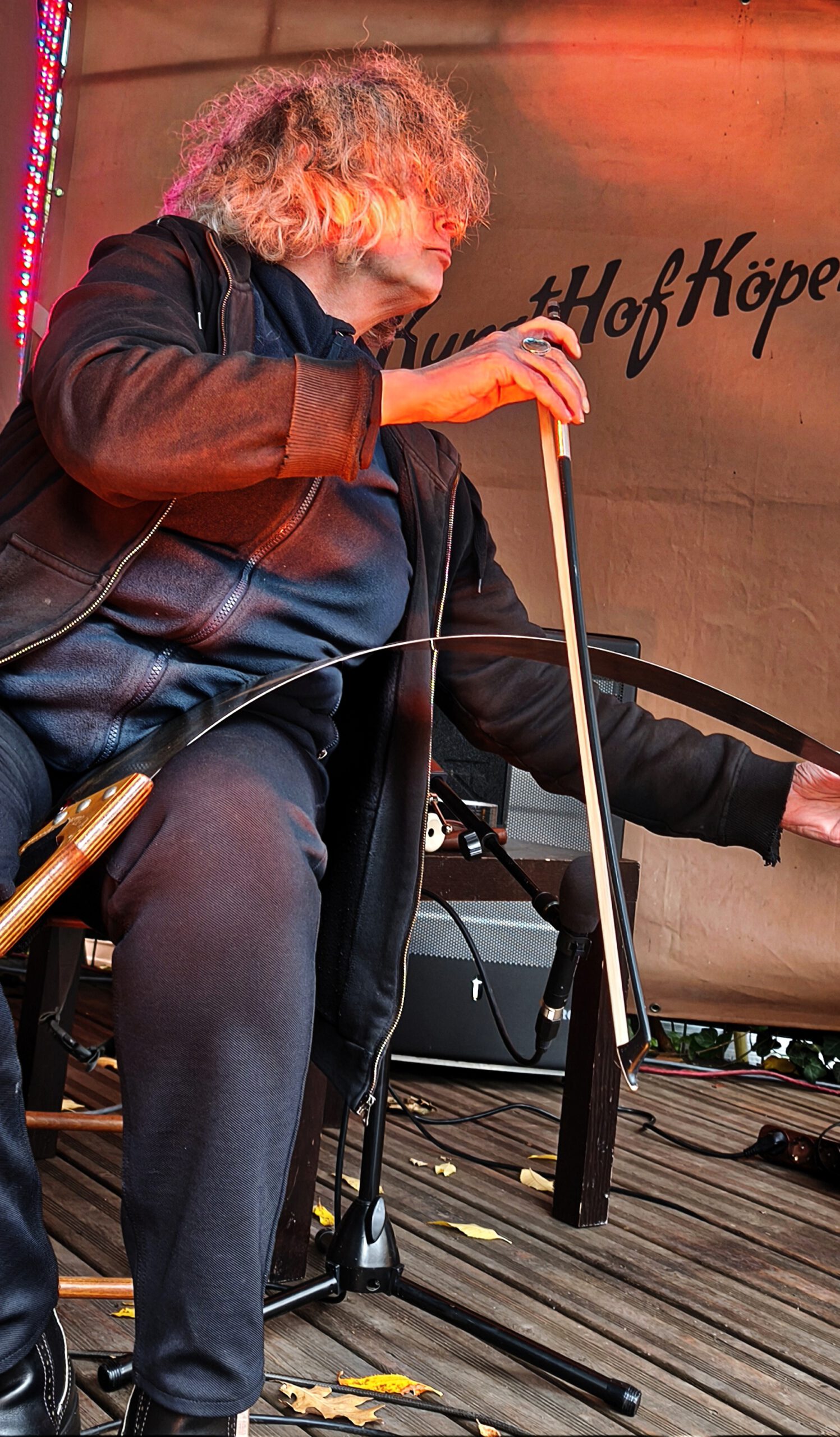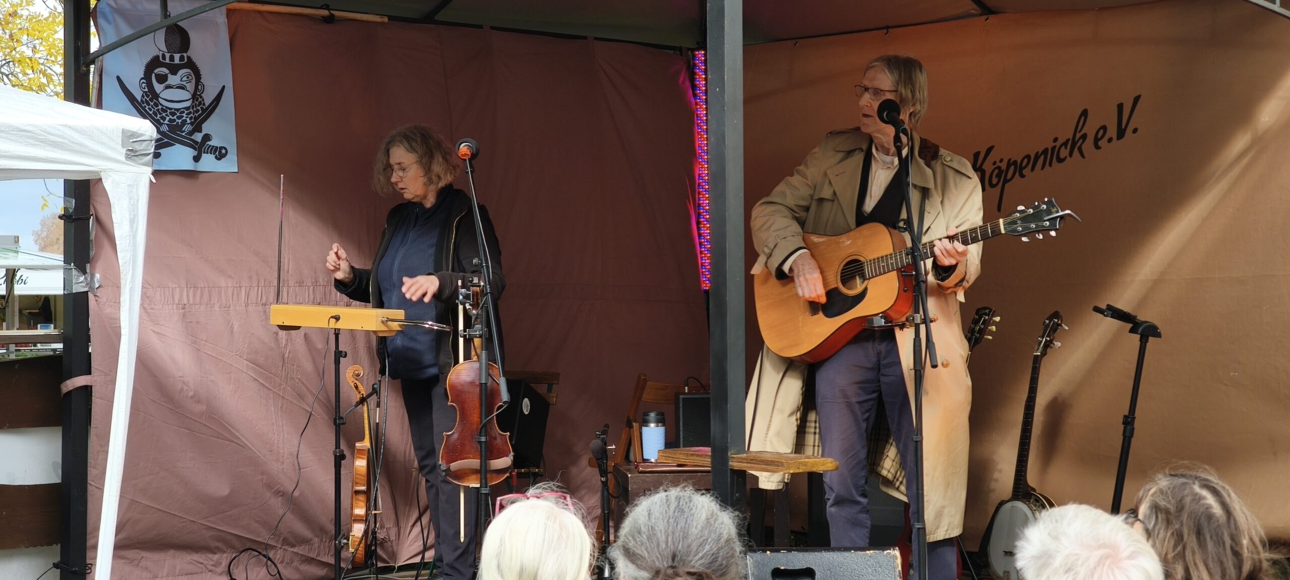 ist Lüül schon lange auf den Straßen und Bühnen dieser Welt, jedoch verschlug es ihn noch nie auf eine Bühne in Köpenick. Na sowas, da muss man doch was machen. Und wo, wenn nicht bei uns auf dem KunstHof, sollte denn die Köpenick-Premiere stattfinden? Und so kam er also, wenn auch n bissel übermüdet, am frühen Morgen zu uns und brachte dazu 3 Gitarren mit und Kerstin Kaernbach, die ihn am Gesang unterstützte und so ganz beiläufig noch wunderbar Viola, Violine, Theremin, Flöte und sogar einmal Singende Säge spielte. Wunderbar! – Tja, …wenn de so ne Kollejin hast, sparste Dir ne Band.