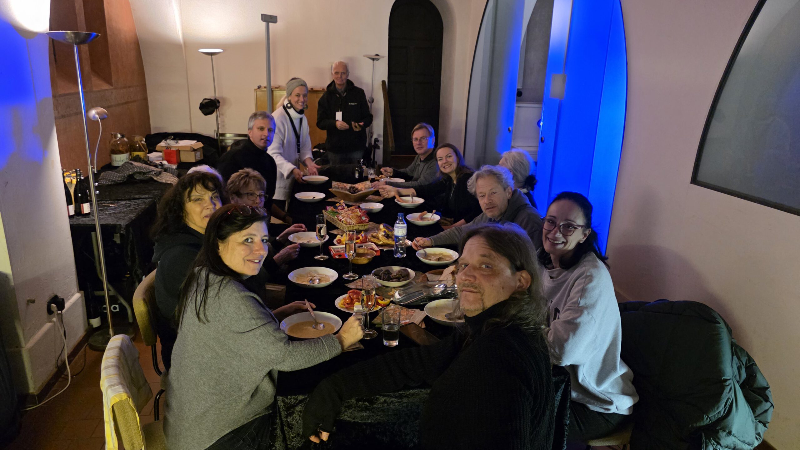 Es wurde vorbereitet und geschwatzt und auf einmal erklang schon Musik aus der Kirche. Die Muschkanten hatten sich eingeschlichen und ohne Umwege den Altarraum geentert, um Soundcheck zu machen. Na ihr hättet auch ruhig erstmal was essen und trinken können 😉 Ok, dann eben so. Holger am Ton (Danke dafür) „verarztete“ alle zufriedenstellend und danach war dann endlich Zeit zusammenzusitzen, die letzten Absprachen zu treffen und Kartoffelsuppe zu essen. (Danke Katja, Premierenkartoffelsuppe gelungen) Nebenbei wurden die Jahresflyer für 2026 und Textzettel für diesen Abend auf den Bänken verteilt und ab und zu kamen schon vor dem offiziellen Einlass Leute in die Kirche um sich Plätze zu sichern….An dieser Stelle sei noch freudig erwähnt, dass zum wiederholten Male unsere Katrin Slomma schon eine Stunde vor Beginn von der Orgelempore Weihnachtslieder flötete, denn wie auf dem KunstHof gilt auch bei unseren Adventskonzerten – Keine Musik aus der Konserve, entweder live oder gar nix. Danke Katrin. Wie schon gesagt strömten die Menschen also sehr früh in die Kirche, draußen wurde es auch langsam ungemütlich, also dann…Willkommen. Wir konnten es ja auch nicht mehr erwarten.